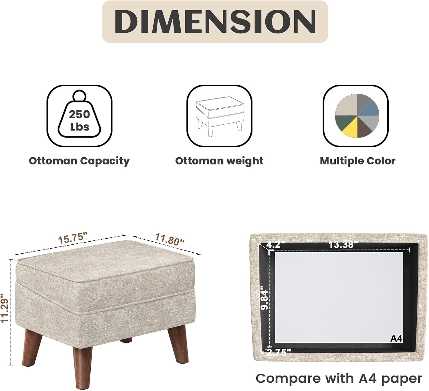 - 【Durable and Sturdy Stool】Our ottoman cushion is made of quality foam covered with skin-friendly linen fabric, the thick and fluffy seat provides a soft and comfortable feeling when you sit on it. The fine grade wood frame and four solid legs make this small ottoman foot rest a strong sturdiness and long service life which holds up to 250 lbs.
