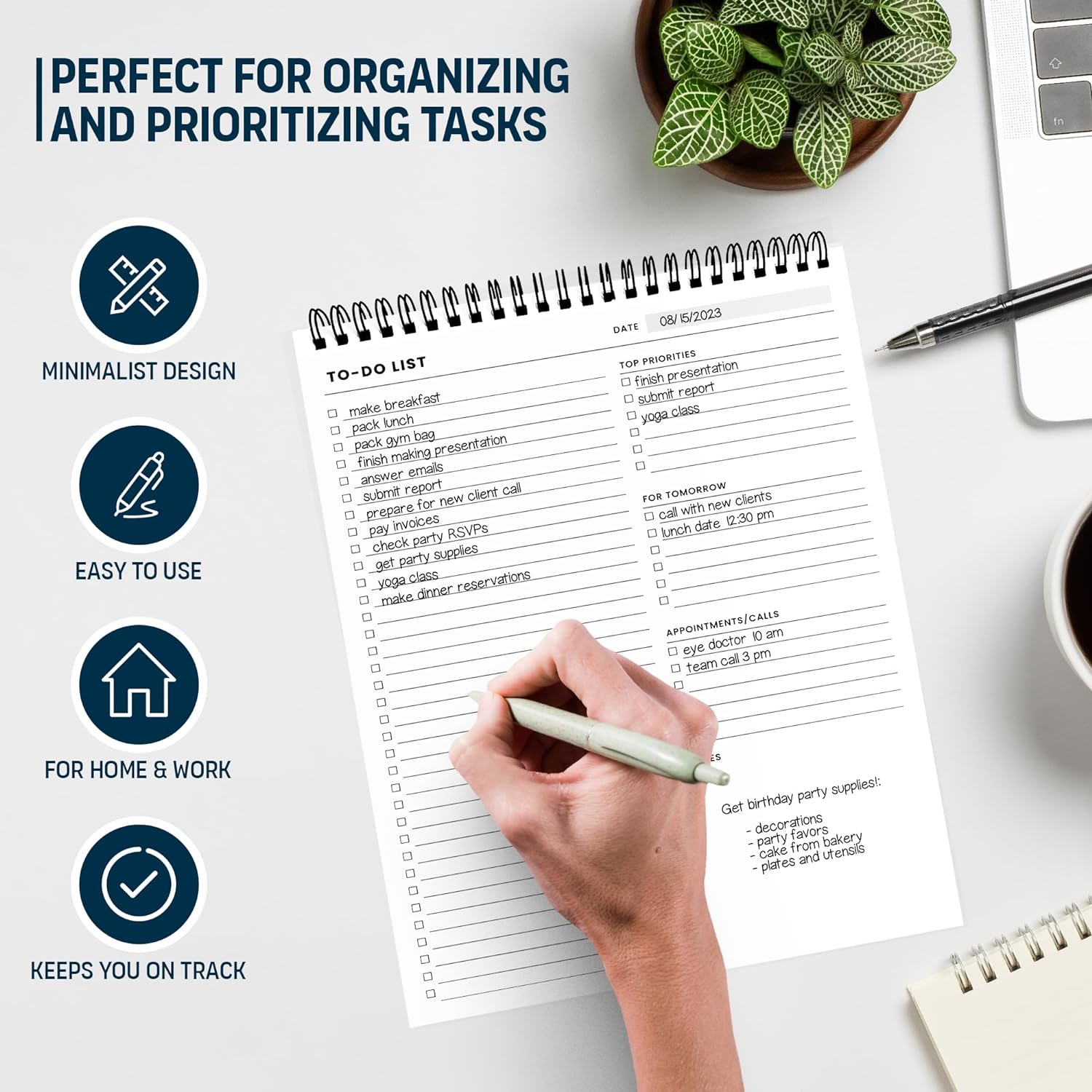 - Spiral Bound with Protective Cover: Our twin spiral-bound notepad lets you start a new page while keeping old ones for reference. It makes it easy to flip through your to-do list. Want to remove your lists when you’re done? No problem! They can be torn out as needed. When you're on the go, the plastic cover on our notepad protects the pages from spills, scratches, and tears. Even better, the cover is see-through so you can quickly glance at your to-do list page as you go about your day.