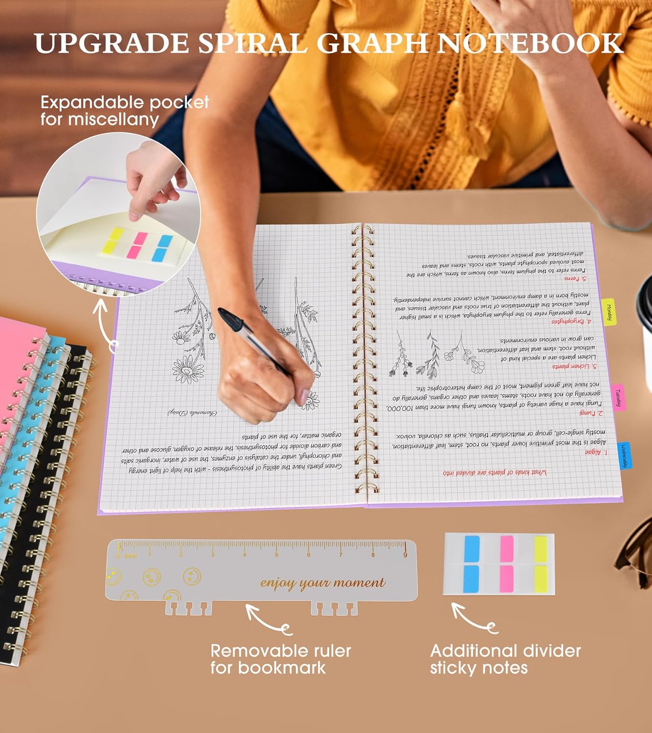 - 【Upgrade Graph Journal Notebook 】The graphing journal has many upgrade features. Come with an elastic closure band, works as bookmarks. Equipped with a removable ruler can help you measure and chart. Personal information page makes it easy to keep track of queries. The back cover includes an expandable pocket for cards and note-taking notes. 1 gift of multicolor index tabs stickers for classification and reference.