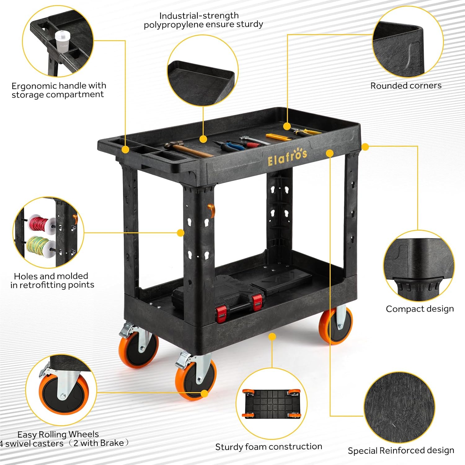 - 🔆 HIGH QUALITY STURDY FOAM CONSTRUCTION :Who doesn’t love products with long lifespans? Made from industrial-strength polypropylene, This service cart is protected from chips or dents. It is also rust, water, and corrosion resistant, and thus suitable for either indoor or outdoor use. Its easy-to-clean surface makes maintenance a breeze as well! High-density structural foam construction makes this two-shelf rolling cart sturdy, lightweight, and maneuverable.