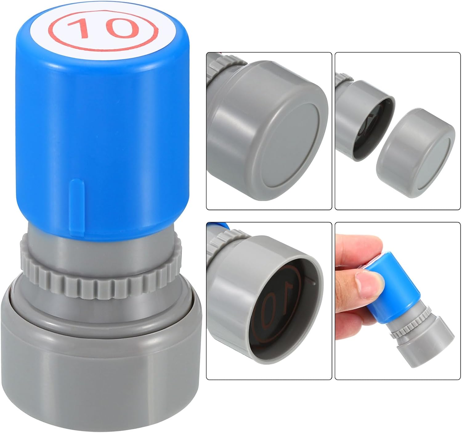 - Ink Color: Red; Shell Color: Blue; Pattern: Digital 10; Material: Plastic; Character Size: 20mm / 0.8 inch; Overall Size: 34 x 63mm / 1.3 x 2.5 inch(D*H); Packing List: 1 x Number Learning Stamp, 1 x Ink