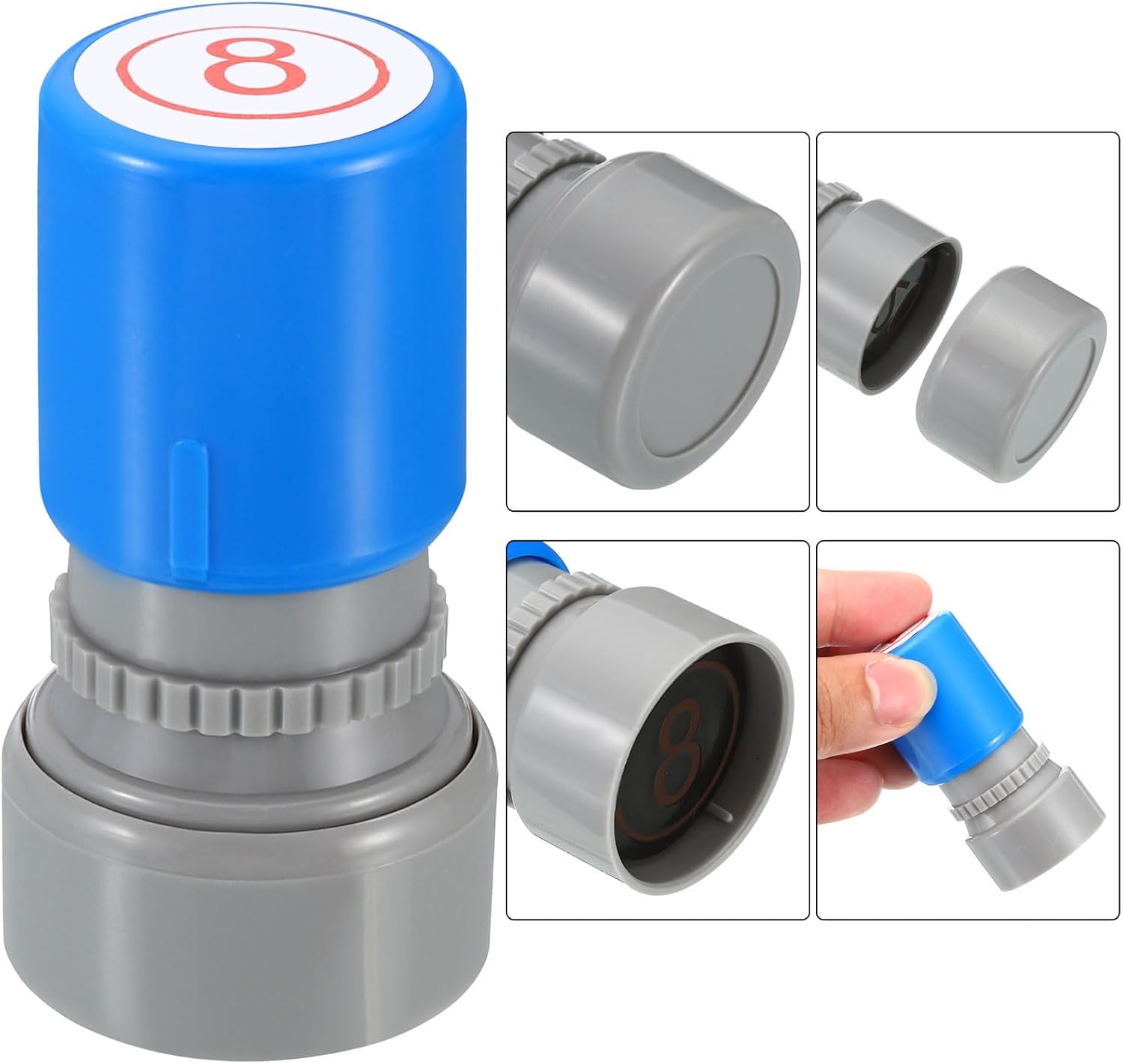 - Ink Color: Red; Shell Color: Blue; Pattern: Digital 8; Material: Plastic; Character Size: 20mm / 0.8 inch; Overall Size: 34 x 63mm / 1.3 x 2.5 inch(D*H); Packing List: 1 x Number Learning Stamp, 1 x Ink