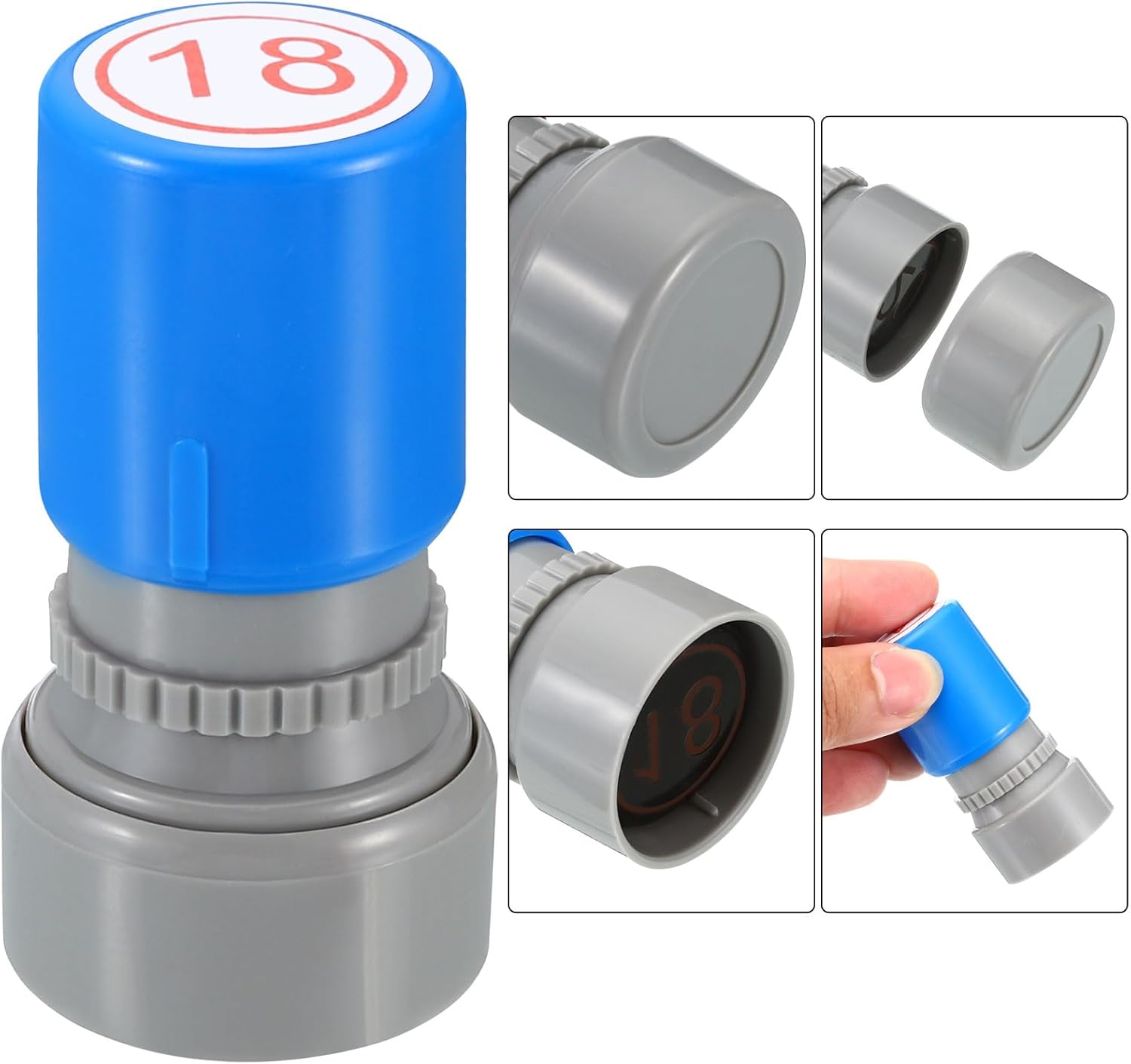 - Ink Color: Red; Shell Color: Blue; Pattern: Digital 18; Material: Plastic; Character Size: 20mm / 0.8 inch; Overall Size: 34 x 63mm / 1.3 x 2.5 inch(D*H); Packing List: 1 x Number Learning Stamp, 1 x Ink