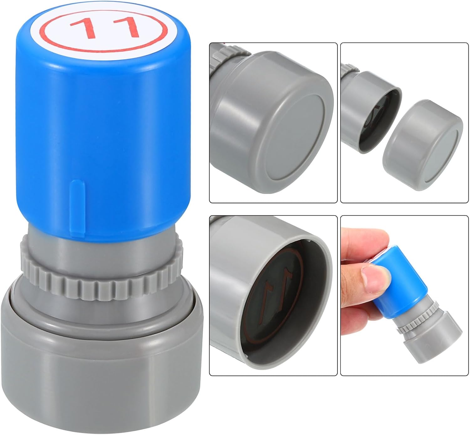 - Ink Color: Red; Shell Color: Blue; Pattern: Digital 11; Material: Plastic; Character Size: 20mm / 0.8 inch; Overall Size: 34 x 63mm / 1.3 x 2.5 inch(D*H); Packing List: 1 x Number Learning Stamp, 1 x Ink