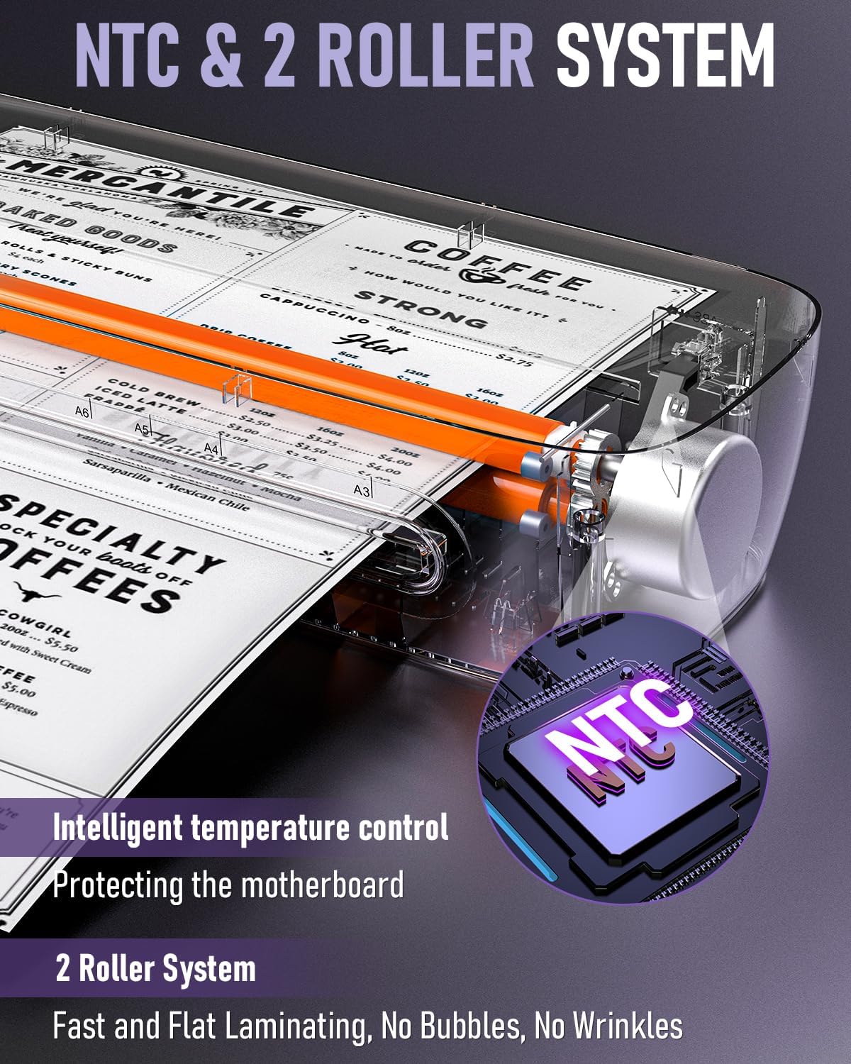 - Dual Roll System & Intelligent Protection: The dual-roll system ensures precise heat and pressure for impeccable lamination, preventing wrinkles, blisters, and curling. Our intelligent temperature control system enhances safety and efficiency, extending the laminator's service life. With an auto shut-off function, you'll stay safe and conserve energy whether you're at school, the office, or home