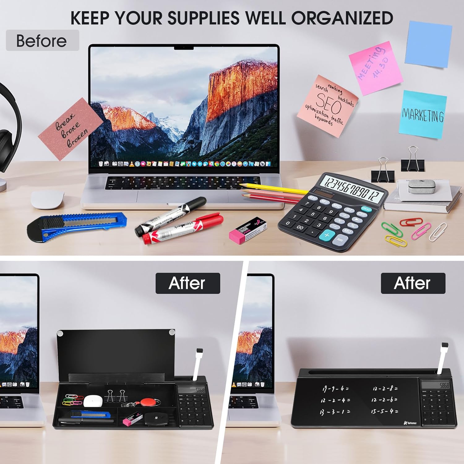 - Removable Calculator: This desk glass white board with removable calculator is an excellent creativity booster for your daily office. The upgraded 12 digit standard functional calculator with LCD display is also an ultimate tool for homework