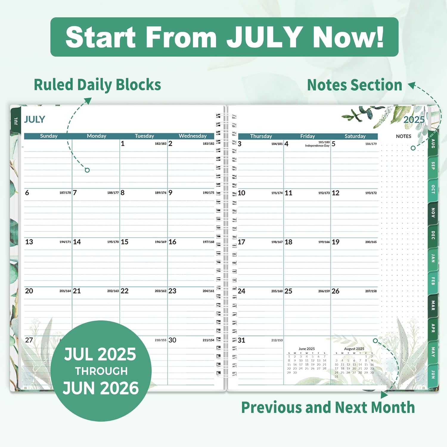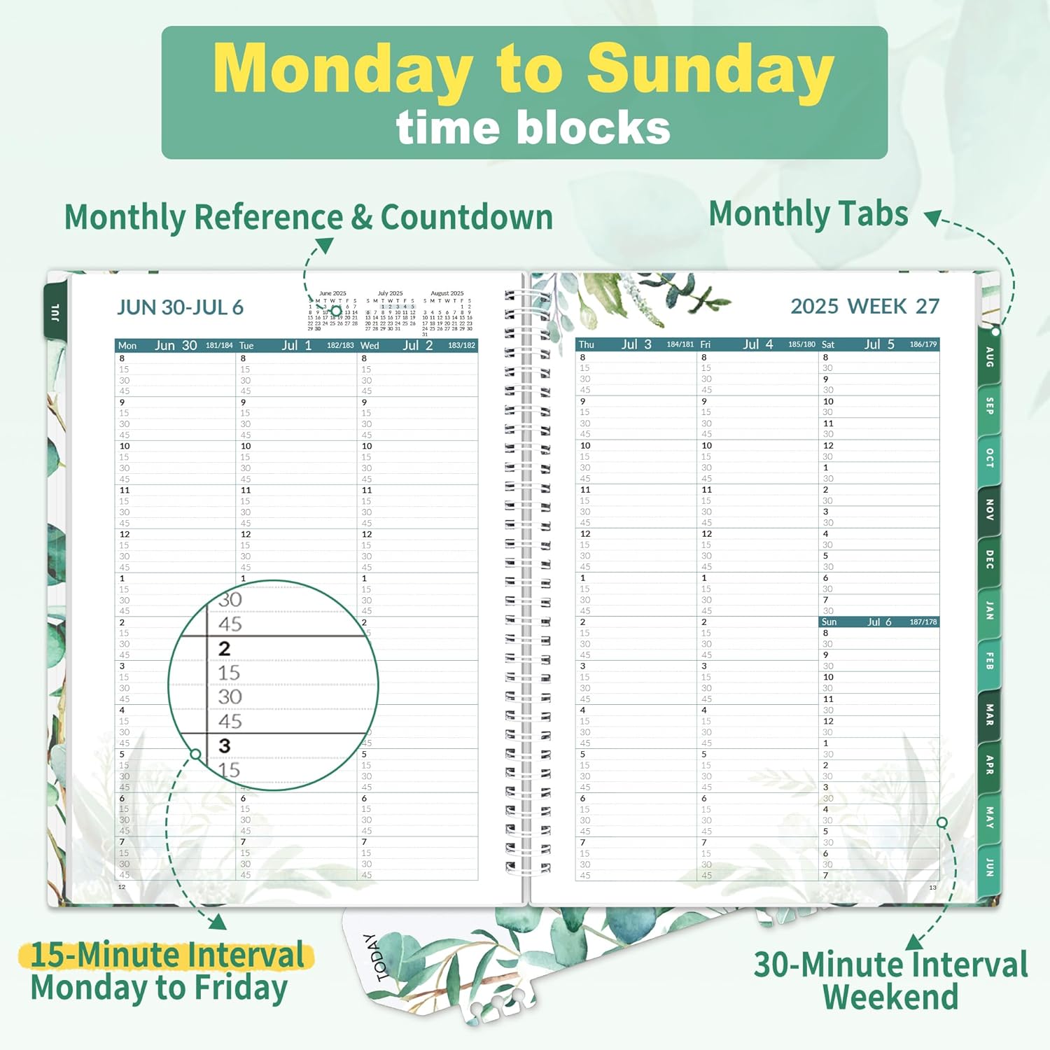 SUNEE 2025-2026 Appointment Book, Quarter-Hourly, Weekly & Monthly - from July 2025 to June 2026, 8.5"x11" Academic Planner, Flexible Cover, Note Pages, Bookmark, Spiral Binding, Leaves