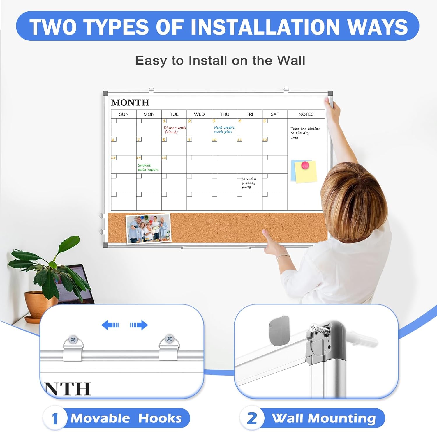 - 【3 in 1 Combo Calendar White/Cork Board】: Our monthly whiteboard can put your life in order and plan ahead. Magnetic dry erase calendar combo board includes cork strip across the bottom. Perfect for pinning notes, messages, pictures, memos, calendars, menus, reminders and more. The magnetic double-sided whiteboard allows you to have two projects going. The other sided is blank. It is the best tool for home teaching or memo.