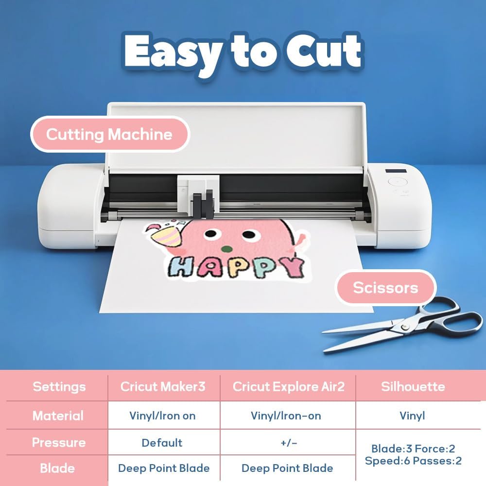 - EASY TO CUT: With advanced formulation, this iron on printer paper for light fabric has successfully solved the problem that traditional light transfer paper cannot be cut with cutting machines. It is compatible with smart cutting machines, allowing the printable vinyl to be cut easily and smoothly with a variety of cutting machines(such as Maker 3, Explore Air 2, Silhouette) and scissors