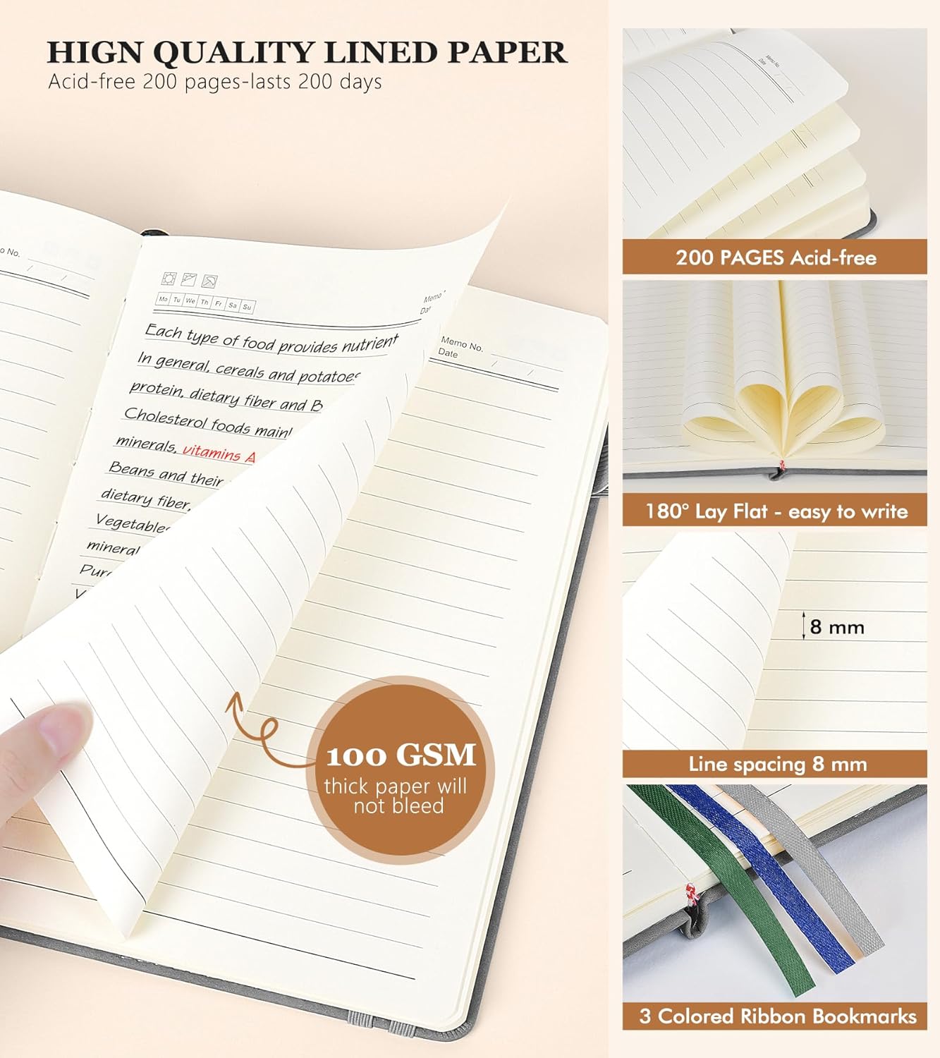 - 【180° LAY FLAT DESIGN & PREMIUM PAPER】: Lay the notebook completely flat for easy writing in any setting—whether at your desk, in a café, or on the go. The 200 pages of 100 GSM lined paper (7mm spacing) offer a smooth writing experience, ideal for journals, work notes, school assignments, or Bible study notes, with minimal ink bleeding or feathering.