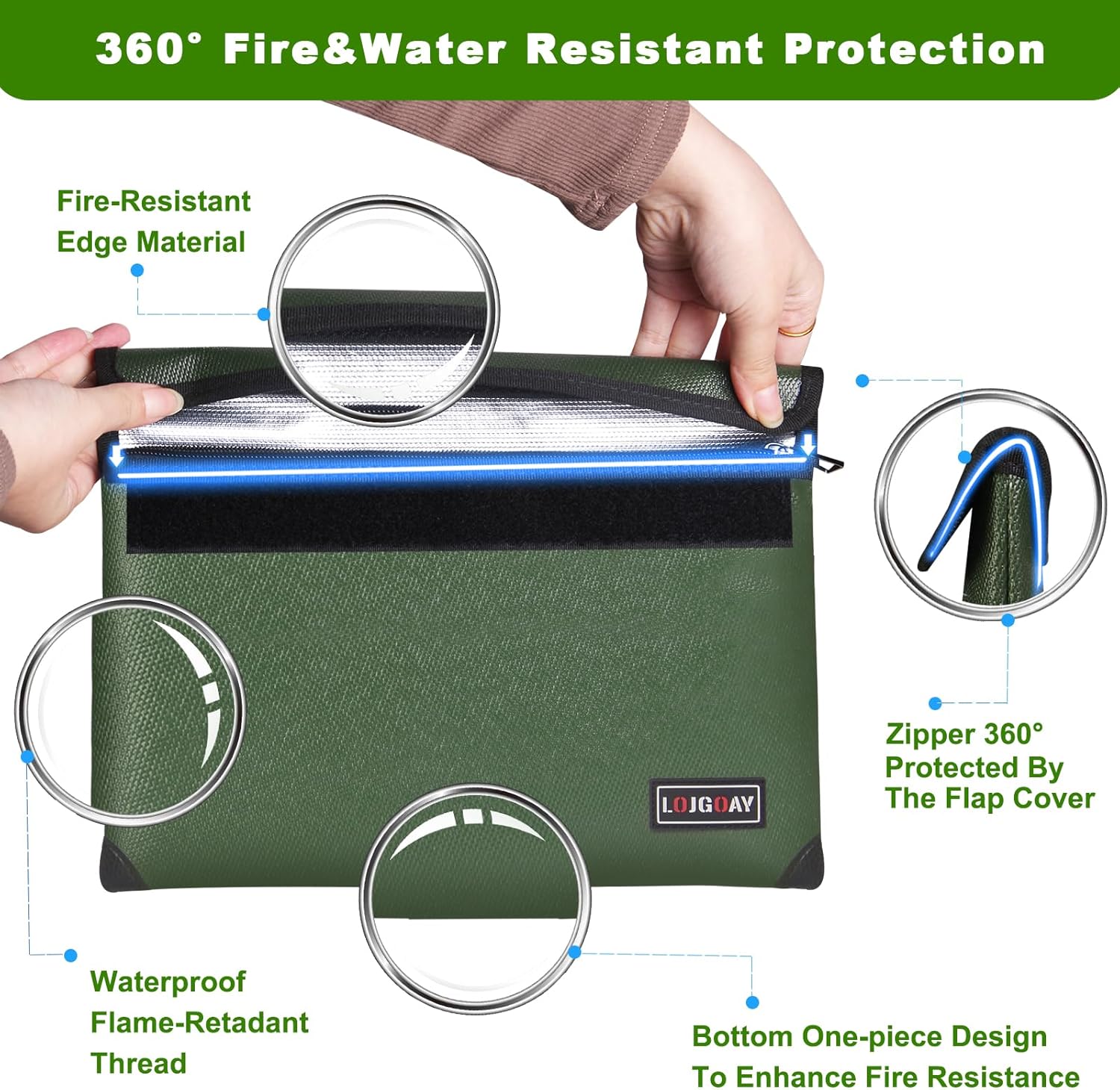 Waterproof Fireproof Document Bag - 5200°F with Heat Insulated, fireproof bags with Zipper, Fire Safe Envelope Bag for Cash/Important Documents/Valuables, fire proof money bag (Green, 13.9"x10.6")