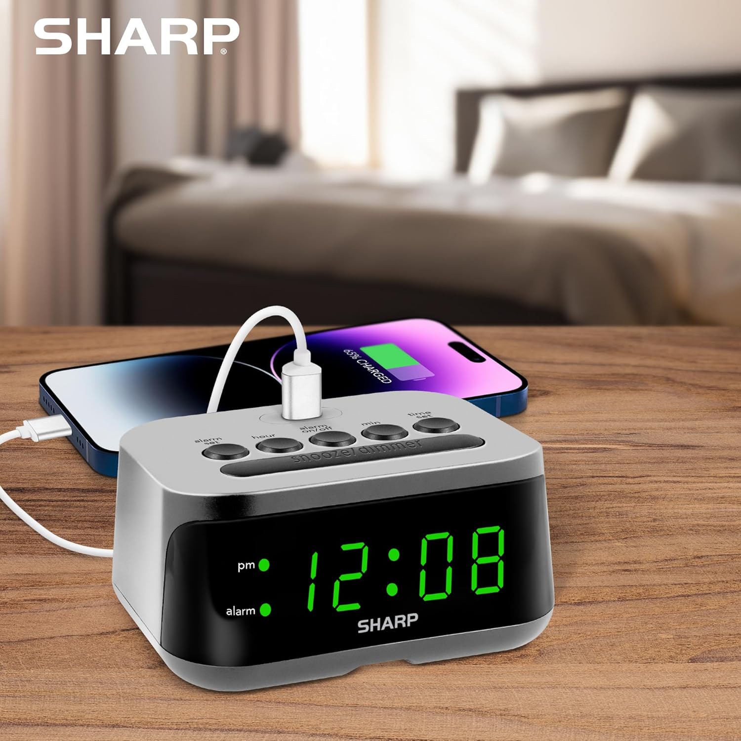 - Wake Up on TIme with the Digital Alarm Clock with USB Charge Port from Sharp (SPC235DGAMZ). The versatile alarm clock conveniently has a High Speed USB-C charge port for Super-Fast charging. The charging port is located on the top of its case where it is easy to access and easy to use and can be used to charge your smartphone or other devices. The small size is a perfect fit for your nightstand, desk, kitchen, home office. Additional accessories shown are not included
