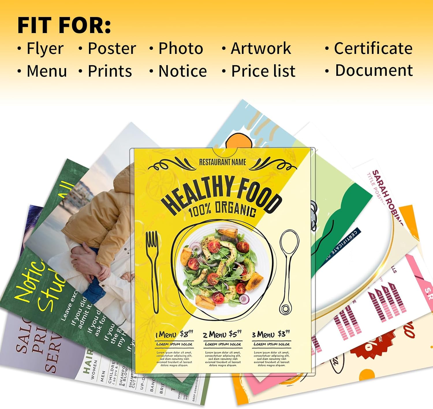 - MULTIPURPOSE USE - Double-sided visibility, horizontally and vertically displayed, top loading design,the display frame is suitable for displaying documents,poster,menus,autographed photos, prints,art paintings,announcements, info, price sheets, reminder signs,advertising leaflets, forms.