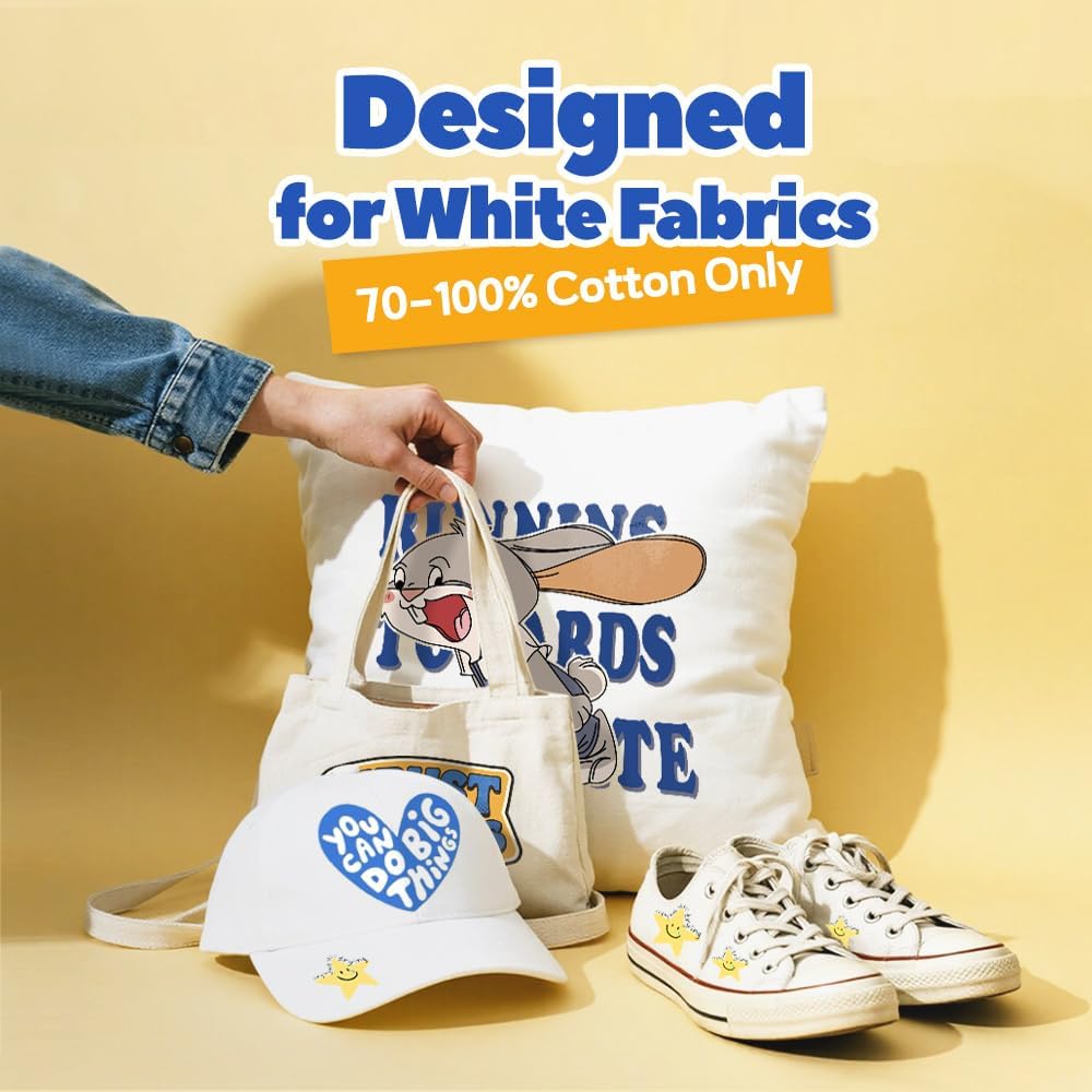 - APPLICATION: Transfer text, images, photos and pictures onto White colored 70%-100% cotton fabrics, such as sweatshirts, hoodies, totes, canvas bags, aprons, masks, pillow cases, cushion covers, tablecloths, flags and banners. Make custom DIY gifts to your family or your friends on Mother's Day, Father's Day, Birthday, Thanksgiving, Easter, Halloween, Christmas, Valentine's Day or Wedding Day.