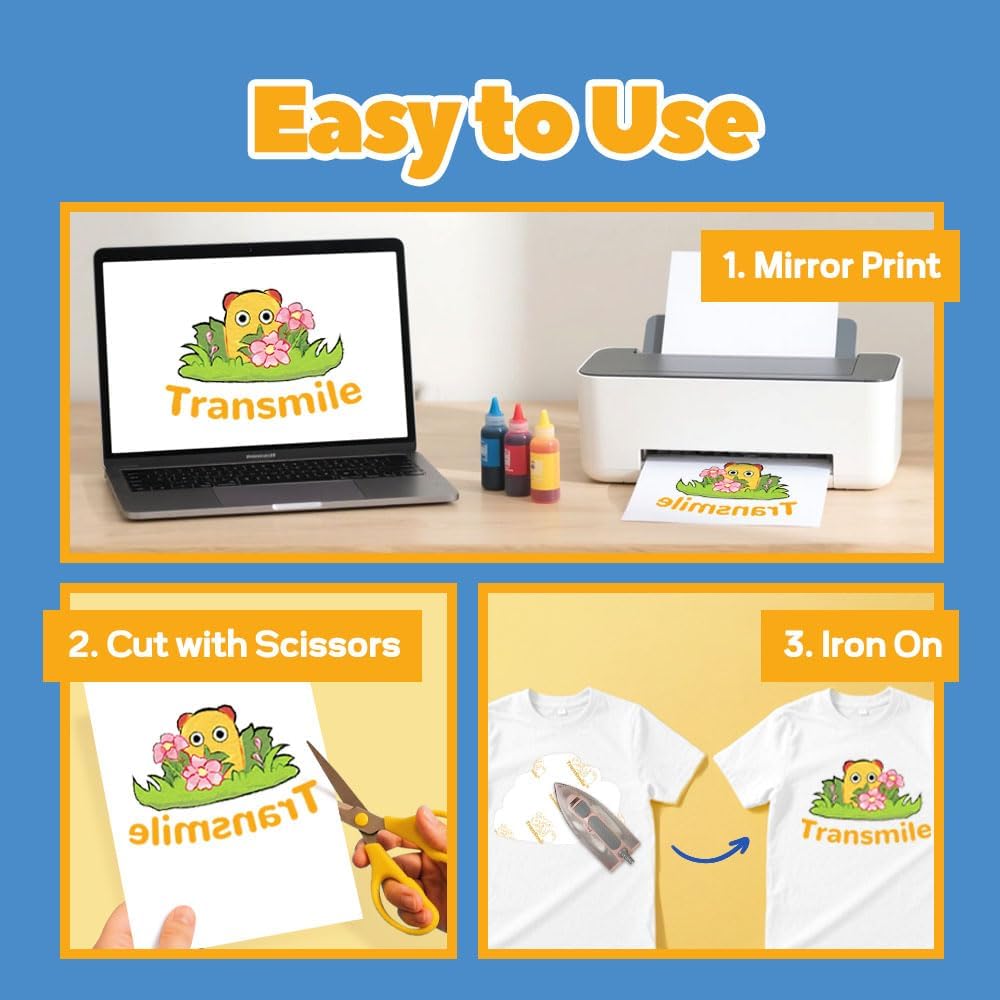 - Easy To Use: [1] Mirror Print & Cut out your design. [2] Place the printed image facing DOWNWARDS onto fabrics. [3] Transfer Image with Iron or Heat Press. [4] Cool peel away the backing paper. Transfer has been done!