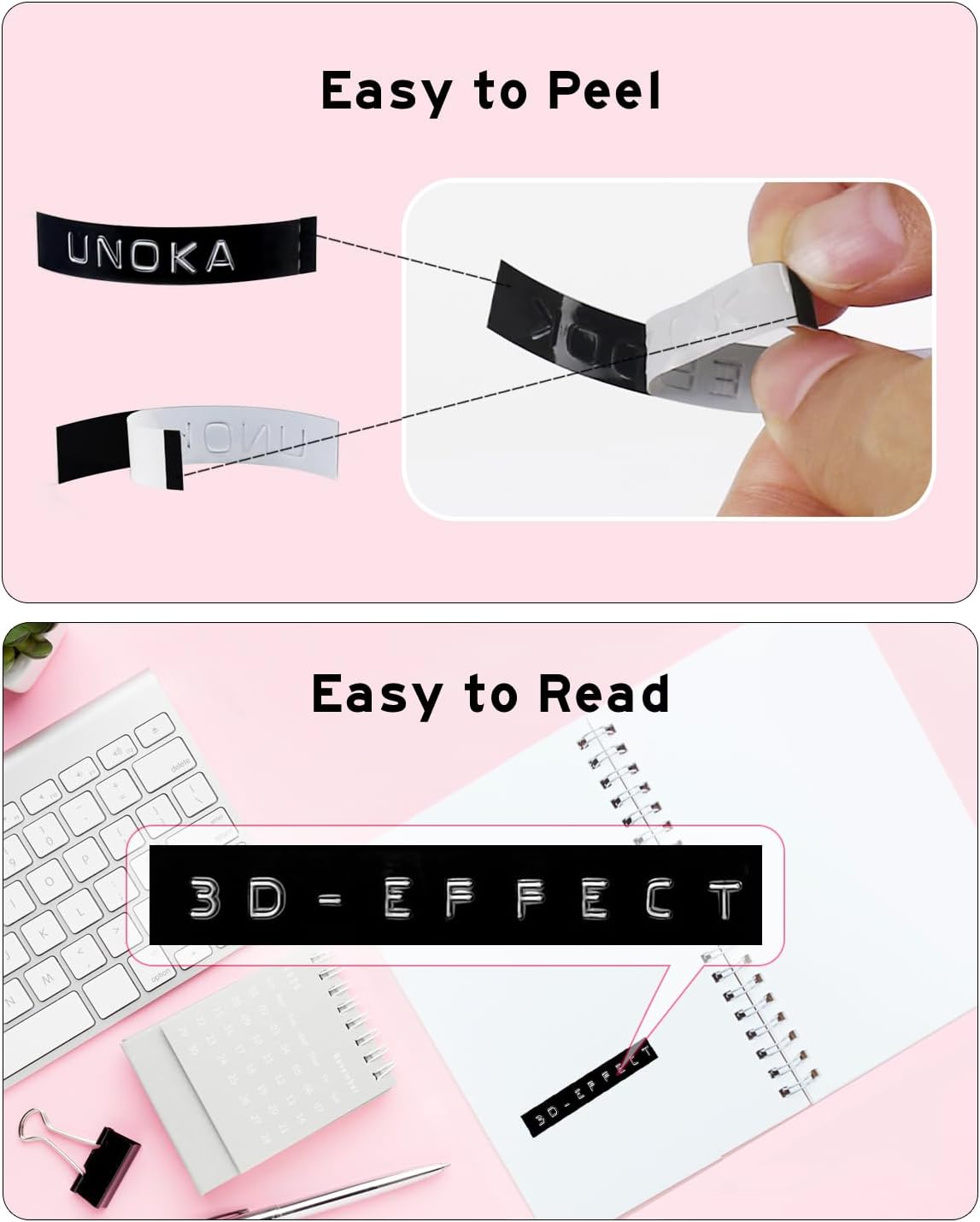 - Easy to Read: UNOKA embossing label tape 3/8 inch shows 3D font effect through pressing. Recognize these 3D white texts even by touching them with your hands
