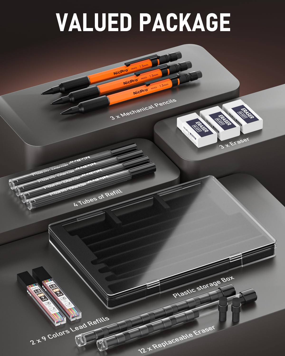 - Mechanical Pencil Set: Come with 3pcs 1.3mm orange mechanical pencil, 3pcs 4B eraser, 12pcs eraser refill, 4 tube of lead refills (12pcs/tube, 120mm length ) and 2 tube x 9 color lead refills. There is also a plastic pencil case included,a realistic set for field work
