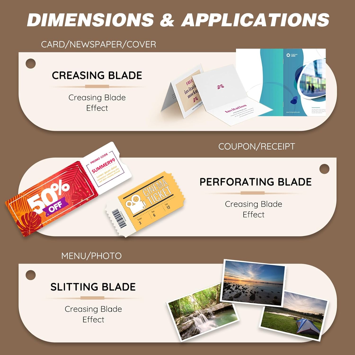 - Versatile Blade Options: Comes with three specialized blades to cater to different needs: a creasing blade with adjustable width options (1.0/1.2/1.5 mm), a perforation blade for dotted lines, and a cutting blade for individual paper trimming (not suitable for thick paper)