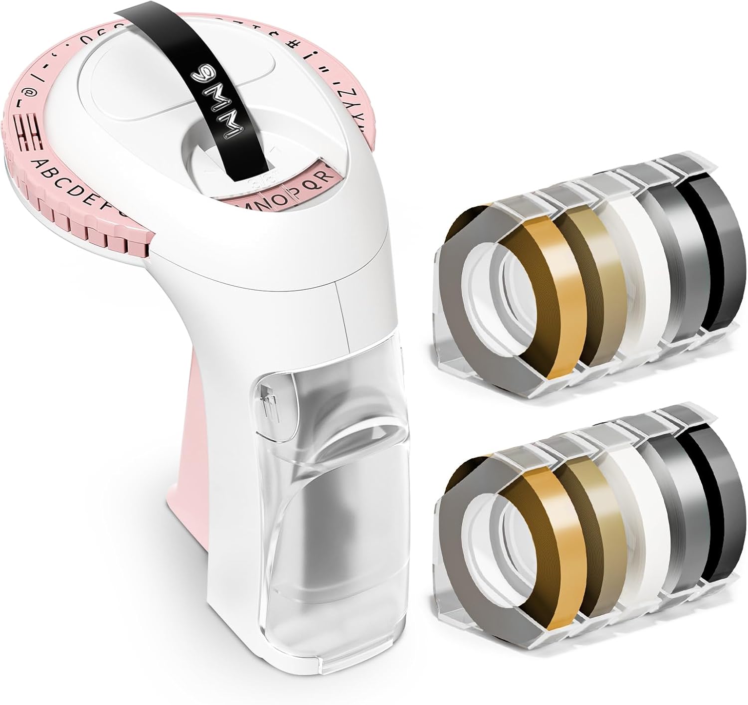 - Package Contents:It will come with a pink embossing label maker and 10 embossing label tapes (2 * champagne gold // 2 * gold / 2 * clear / 2 * silver / 2 * black embossing tape) 48 characters available for continuous use