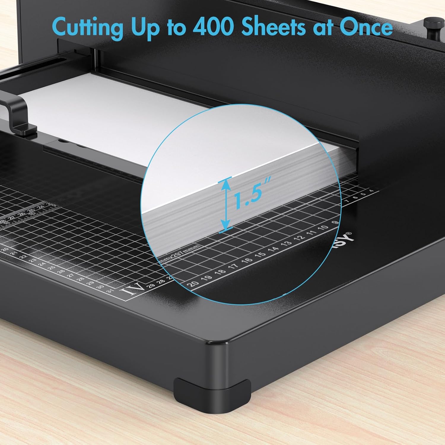 - [Versatile Cutting Capacity] This robust paper cutter effortlessly slices through up to 400 sheets (1.5" thick, A4 size), as well as materials such as PVC, leather, and fabric, meeting diverse cutting demands in homes, offices, schools, and print shops