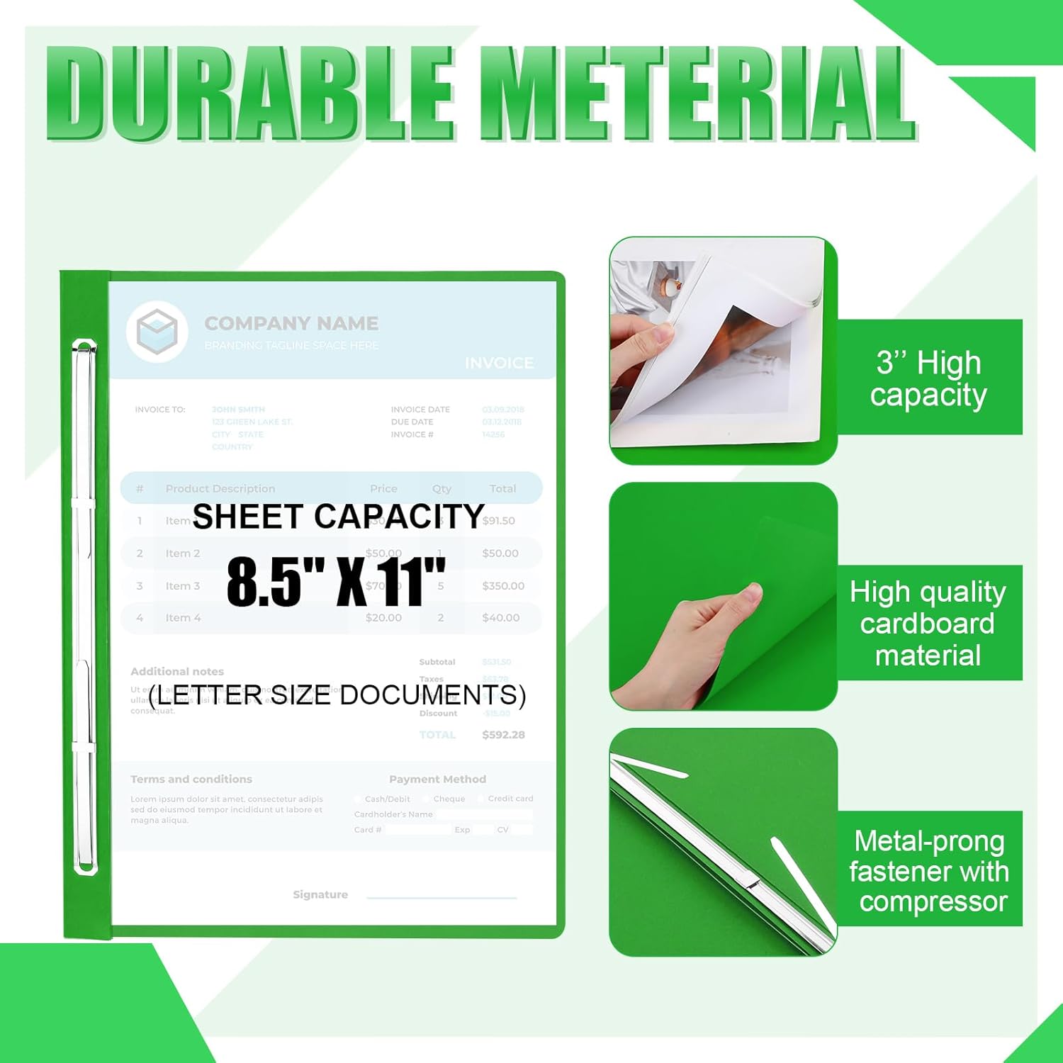 - Metal Prongs with Compressor: our green certificate folders are not only visually appealing but also practical; They come with a 2 holes metal prong with a compressor measuring about 8-1/2 inches; These metal prongs are sturdy, durable, and more convenient to use; They can effectively keep your documents in place and reduce volume for a neat presentation