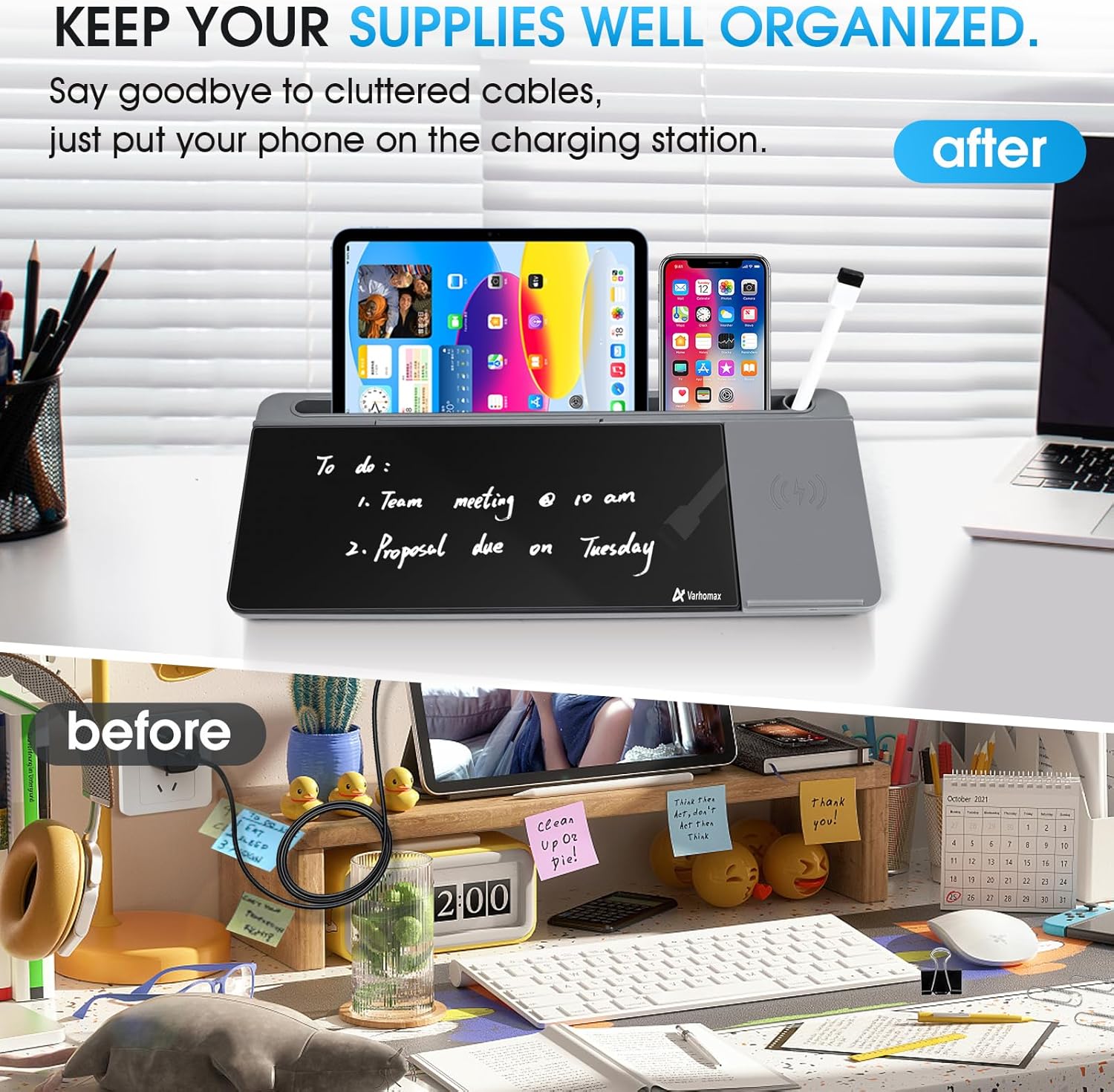 - Multi-functional: Sitting compactly between your monitor and keyboard, you can use it as a desk to do list whiteboard, or phone charger, or phone/tablet holder, or keyboard stand. It can used for your office task organization, family schedule and workout plan