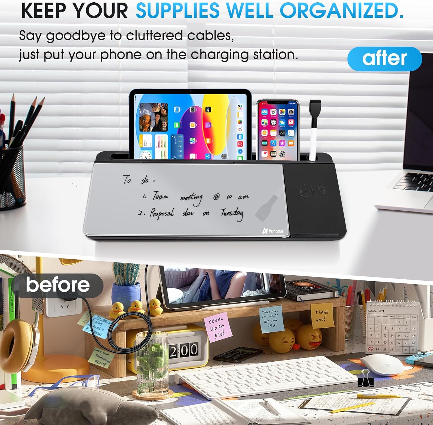 - Multi-functional Design- Sitting compactly between your monitor and keyboard, you can use it as a desk to do list whiteboard, or phone charger, or phone/tablet holder, or keyboard stand. It can used for your office task organization, family schedule, workout plan and your kids' learning.