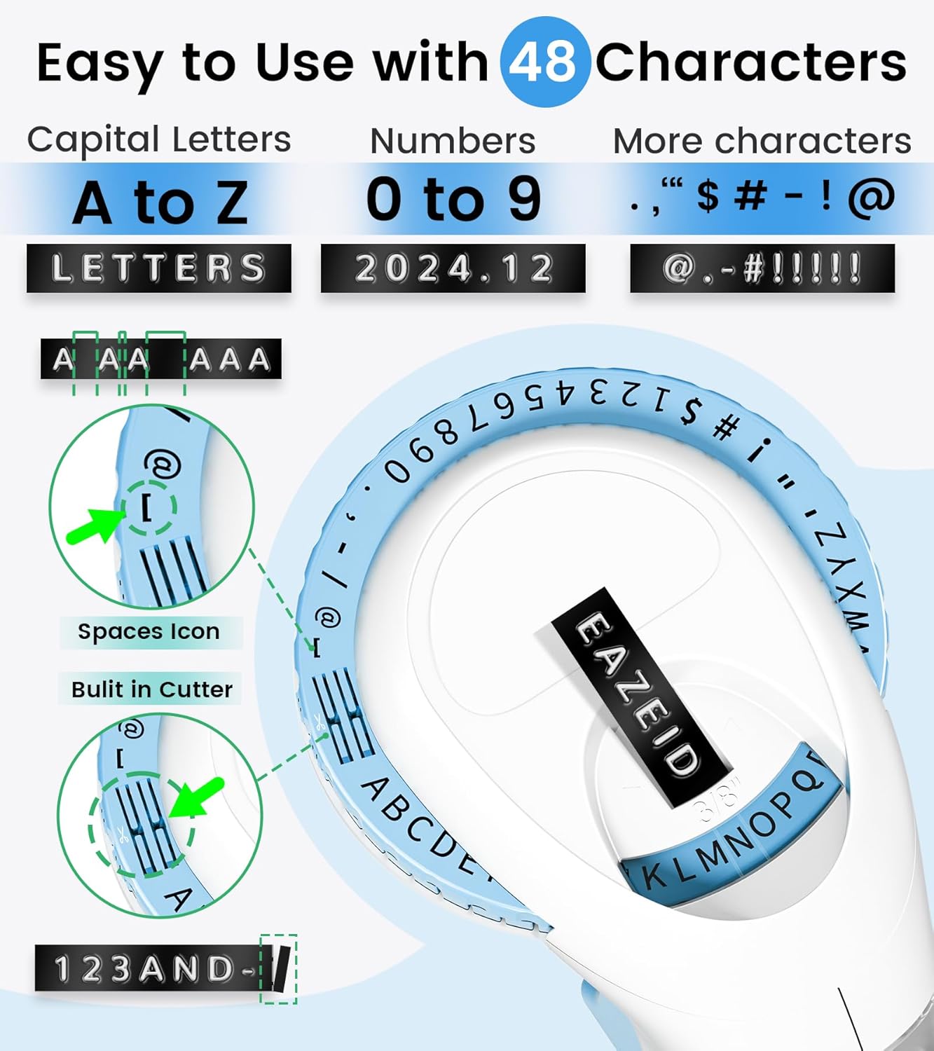 - 48 Useful Characters : With its embossing dials, this special EazeID personal labeler machine punch label maker includes all the essential characters. From English letters "A TO Z" to numbers "0 to 9," and common symbols like " . ,‘“ $ # - ! @", it covers all your labeling needs