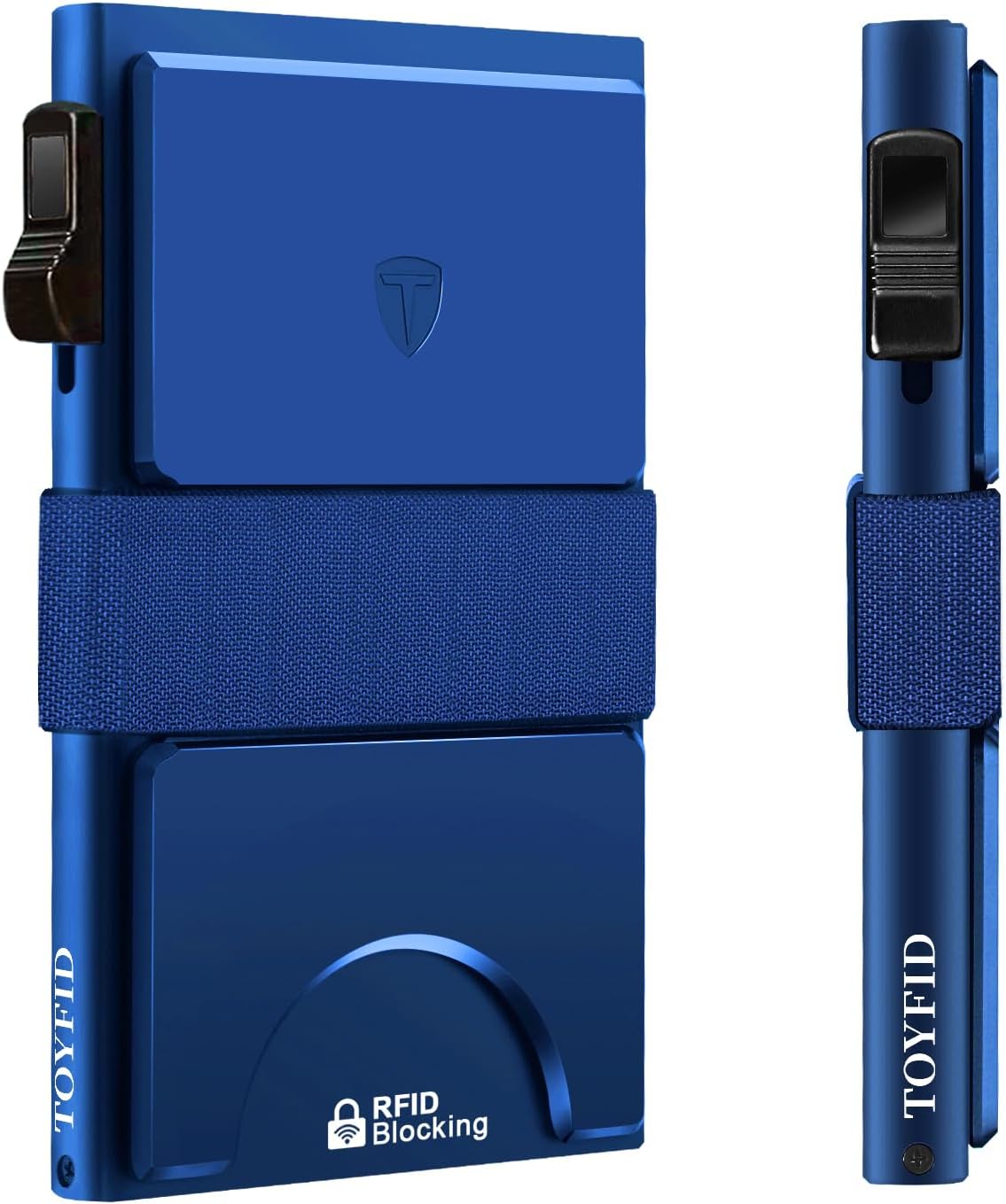 Slim Wallet for Men Aluminum Minimalist Pop Up Card Holder with RFID Blocking Protection Expandable Backplate Cash Band for Boyfriend/Dad/Friend,Holds 12+ Credit Card & Business Cards,Blue