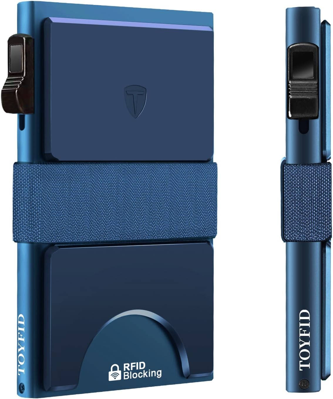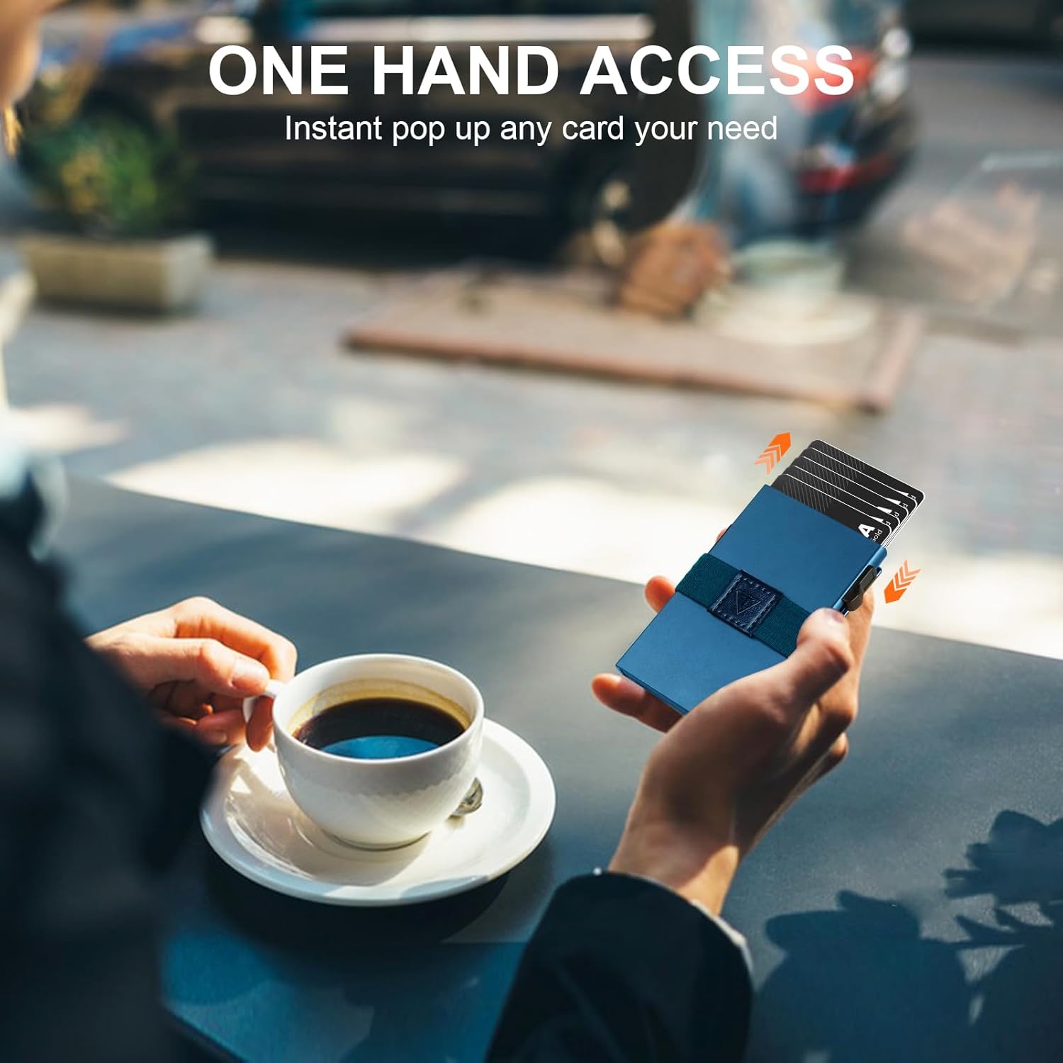 Slim Wallet for Men, Minimalist Pop Up Wallet, Metal Wallet, RFID Blocking Mens Wallets with Expandable Backplate & Cash Band, Holds 12+ Cards Plus Cash, Navy Blue