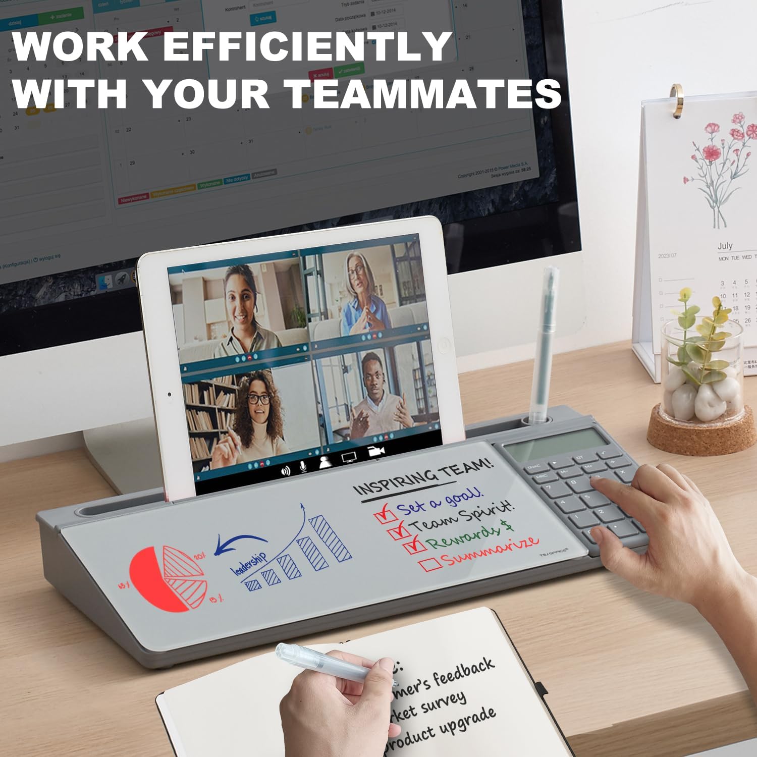 - PERFECT DESIGN: Maximize your work area. The desktop whiteboard is designed to sit perfectly between a keyboard and monitor and is slope angled for comfortable reading and writing, or typing when you are using it as a keyboard stand.