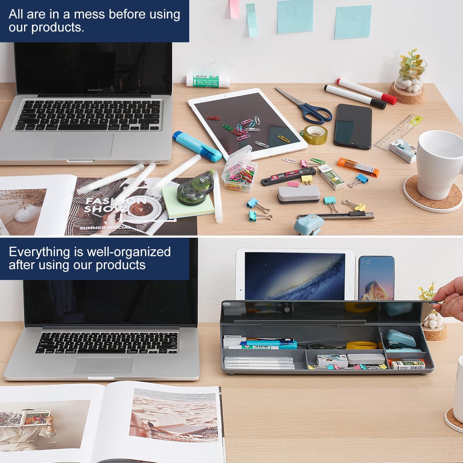 - HIDDEN STORAGE & PAD/MOBILE TRAY: De-clutter your desk by storing markers, magnetic eraser and other desktop accessories in the opening drawer or place markers on the accessory tray for quick access. And one more long tray on the top of the dry erase white board for your pad or mobile.