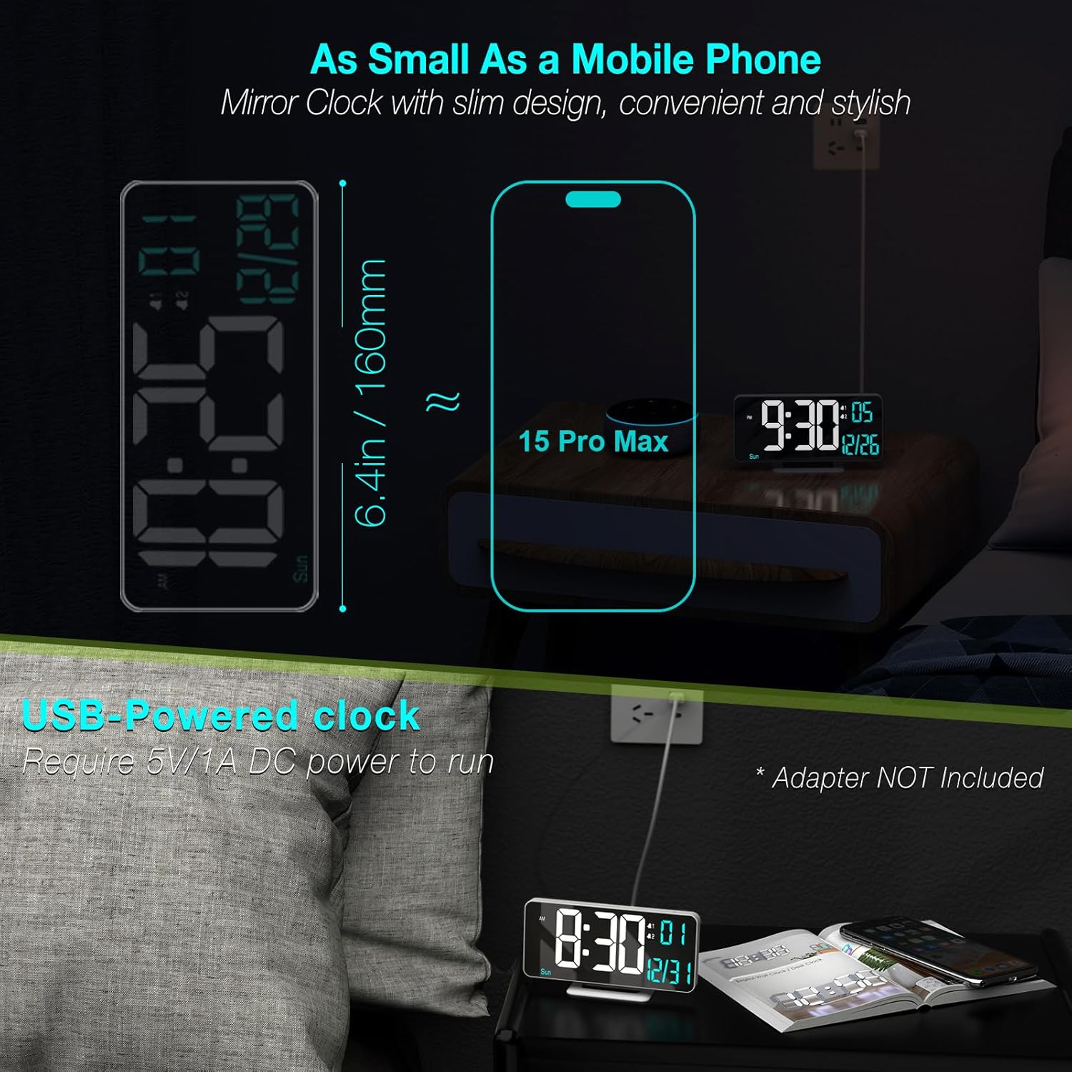 - [6.7in White Alarm Clock] This stylish LED desk clock features 6.7-inch display of mirror clock style, dual alarms, 12/24-hour format, date, day of week, seconds, temperature (β / β), and auto/manual dimming, it is also a aesthetic digital calendar and cute alarm clock for bedroom with white and sky blue numbers. Additionally, the bright white and sky blue digits make the desk clock cool and easy-to-read.