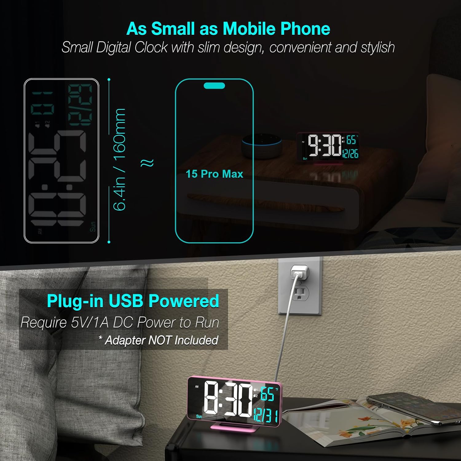 - [6.7in Pink Digital Clock] This cute pink clock features 6.7-inch display of mirror clock style, dual alarms, 12/24-hour format, date, day of week, seconds, temperature (β / β), and auto/manual dimming, it is also a modern digital calendar and cute alarm clock for girls bedroom decor. Additionally, the bright white and sky blue digits make the desk clock so cool and easy-to-read.