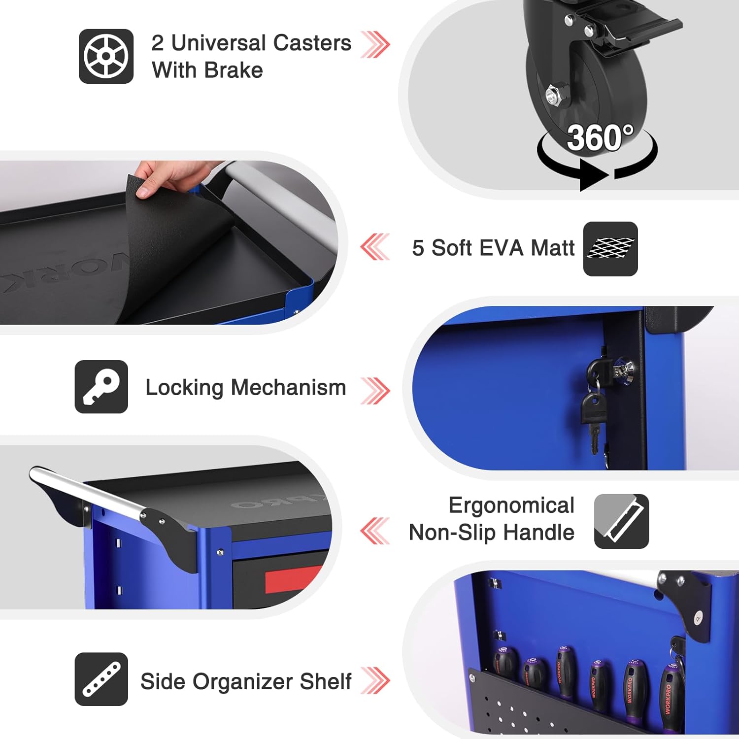 • Easy Storage: Large Storage Space; 2 drawers with lock and smooth ball bearing slides; 2 side organizer shelf for screwdrivers; Removable 2nd Tray for more DIY need; Easier to assemble with premounted, threaded bolts