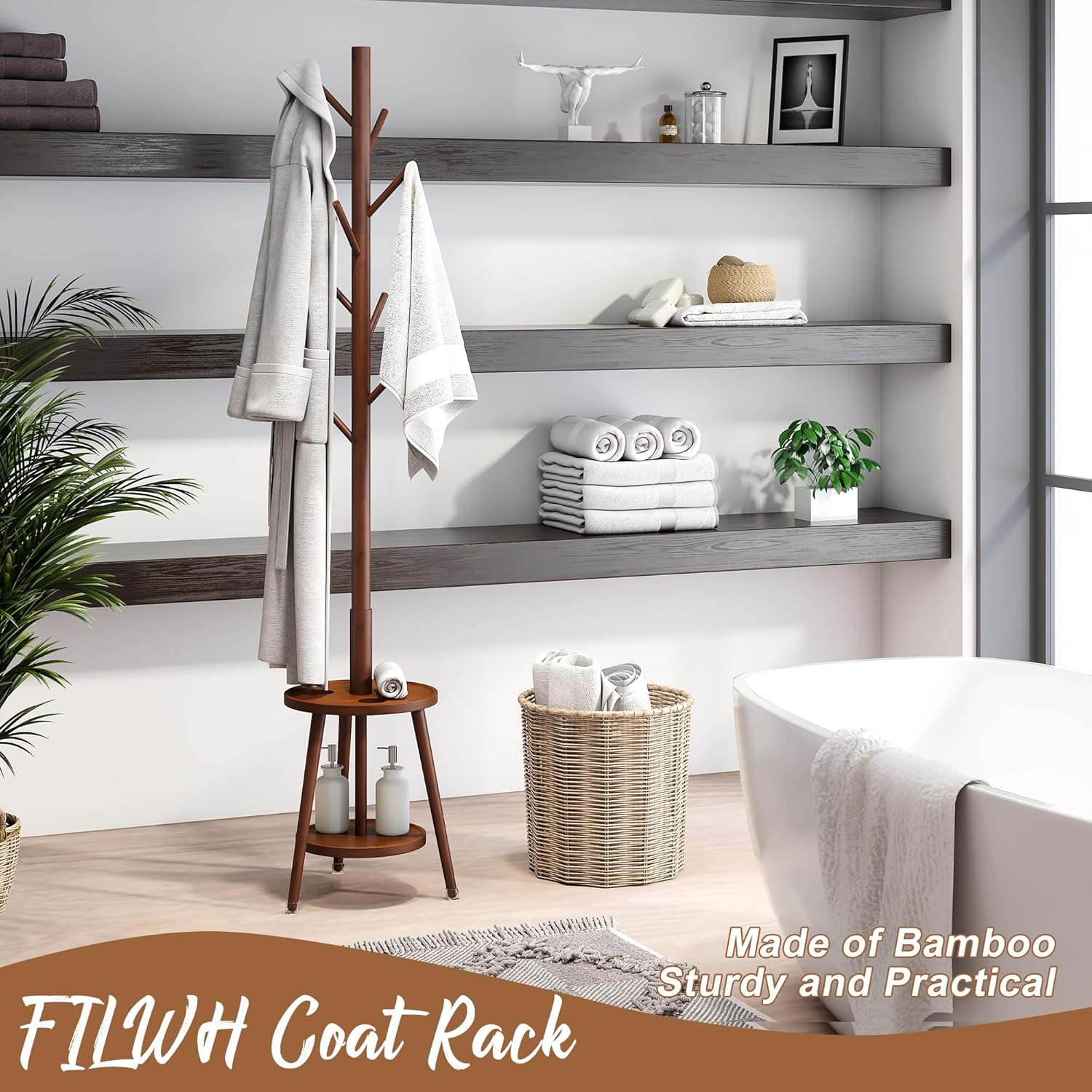 FILWH Freestanding Coat Rack with Umbrella Organizer Tray Bamboo Coat Tree Rack with 8 Hook Stand for Clothes Bag Hats Entryway Hanger Stand(Brown)