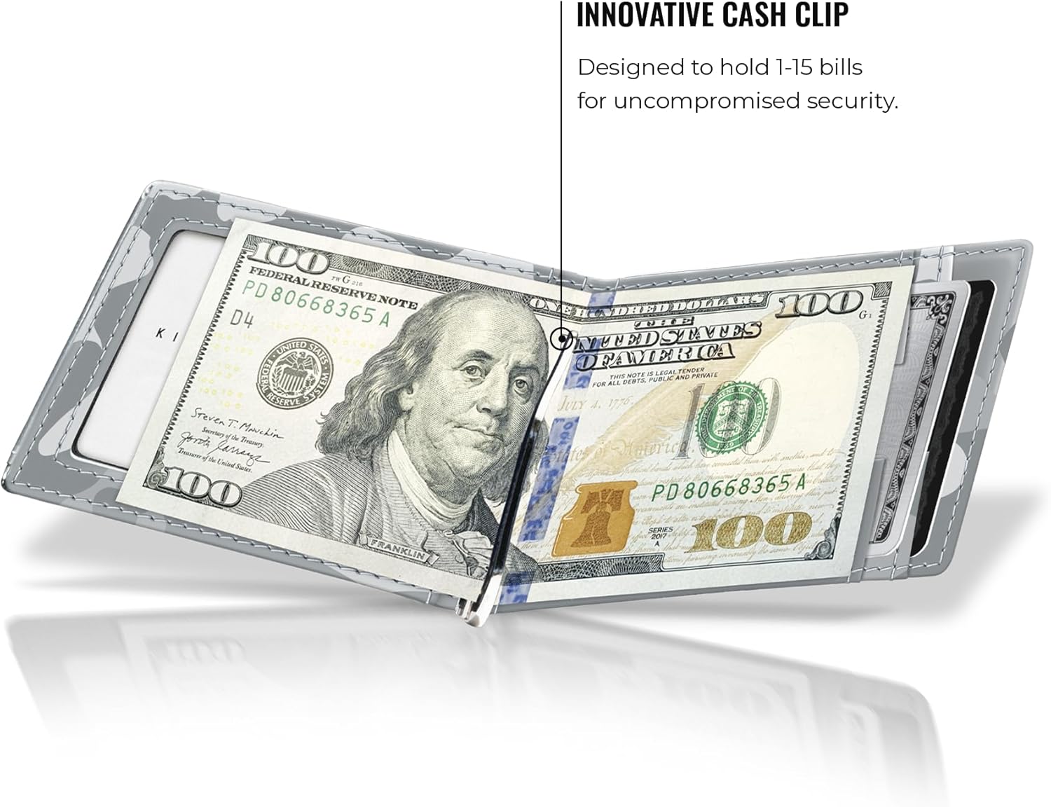 Kings Loot Money Clip Slim Minimalist Wallet for Men – RFID Blocking Leather Design with Money Clip – Front Pocket Bifold Holds 12 Cards – Stylish & Compact Wallets (Camo White)
