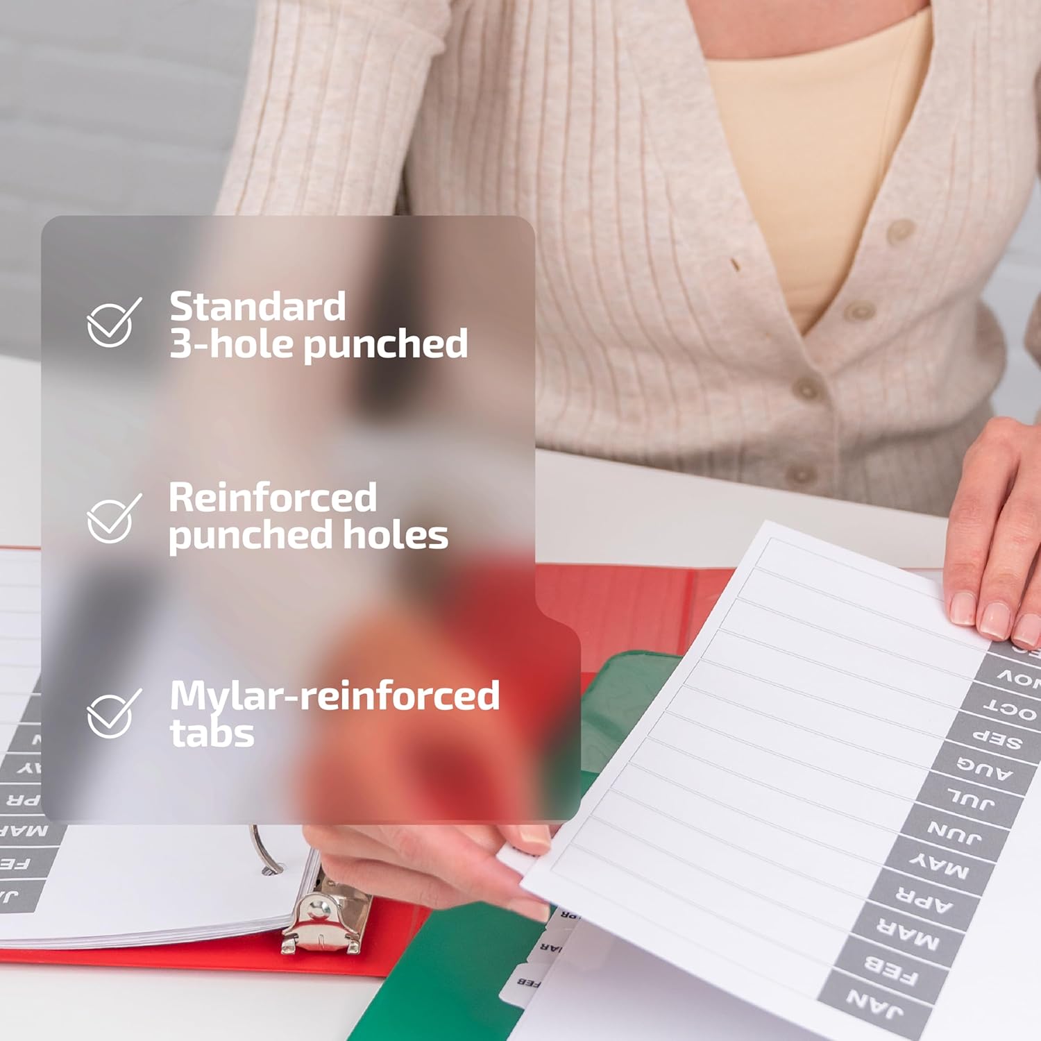 - REINFORCED PUNCHED HOLES: Each hole punch is reinforced to prevent tearing or damage. The tabs are ideal for home, office, and school use.
