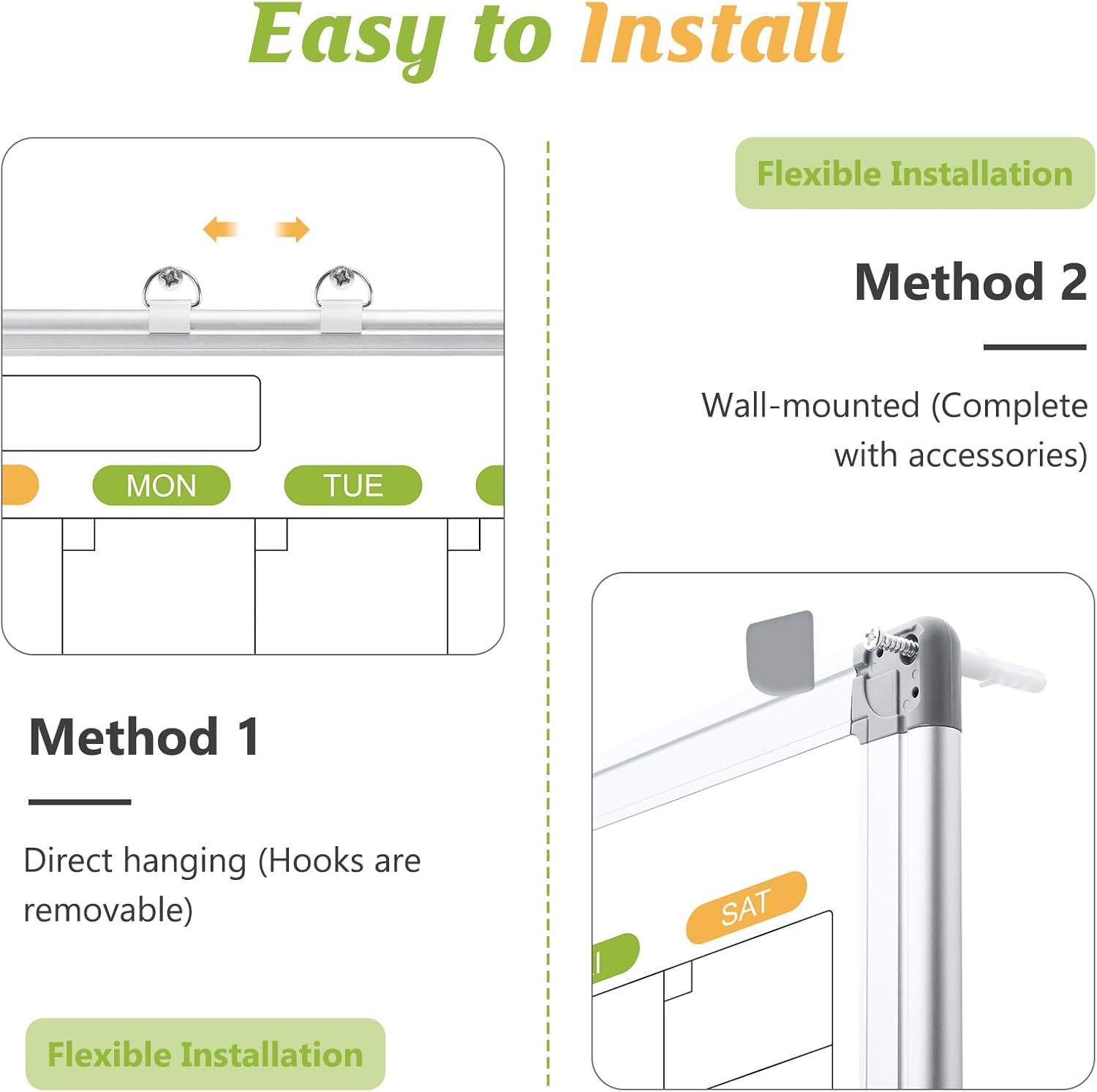 - 【2 Simple Installation Methods】: 𝑴𝒆𝒕𝒉𝒐𝒅 1 - Use the sliding hooks equipped with the calendar whiteboard for wall to hang directly to the wall; 𝑴𝒆𝒕𝒉𝒐𝒅 2: Use the screw holes on the corners of the frame to install. It comes with covers so it would look super clean with no visible screws. Installation is very simple and flexible, it can be hung horizontally or vertically according to your needs