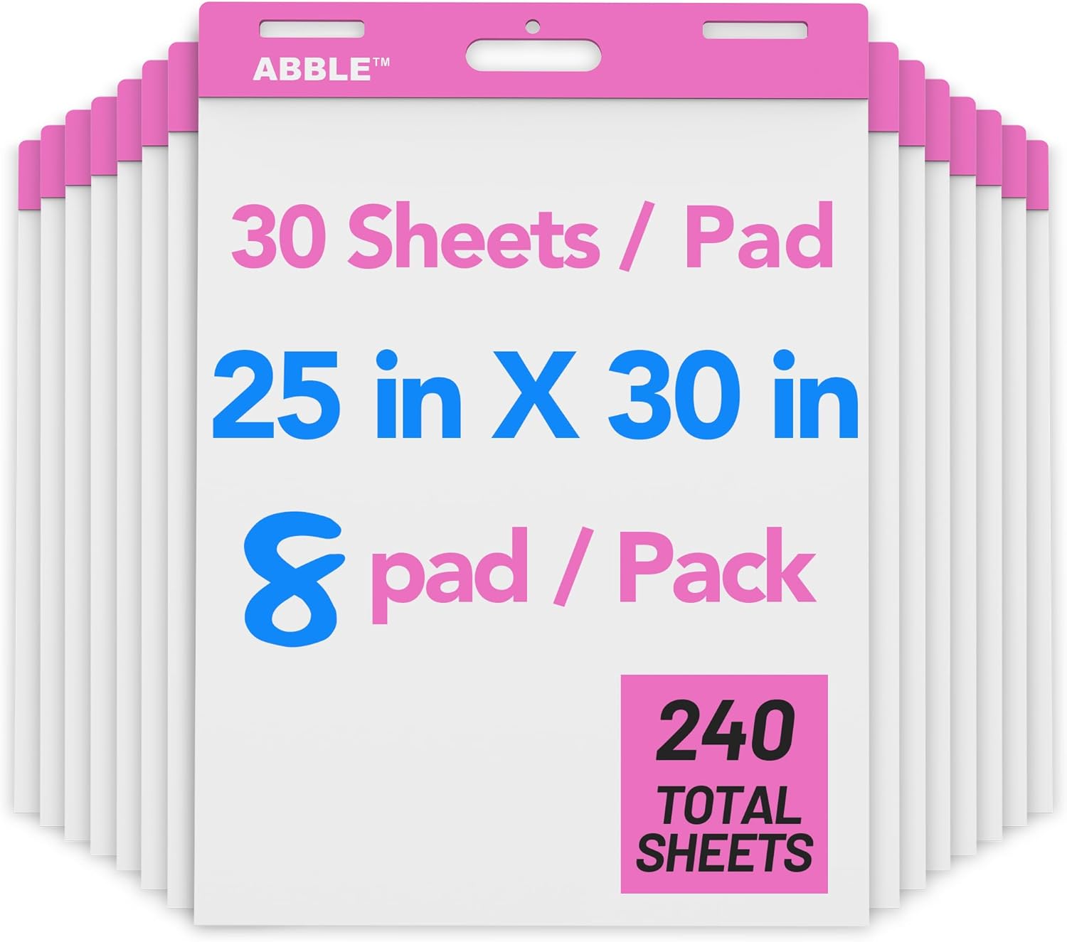 Super Sticky Easel Pad, 25 x 30 Inches, 30 Sheets/Pad, 8 Pads/Pack (PinK), Large Self Stick Flip Chart Paper for Whiteboards, Premium White Chart Paper for Teachers, Office, and Classroom Supplies