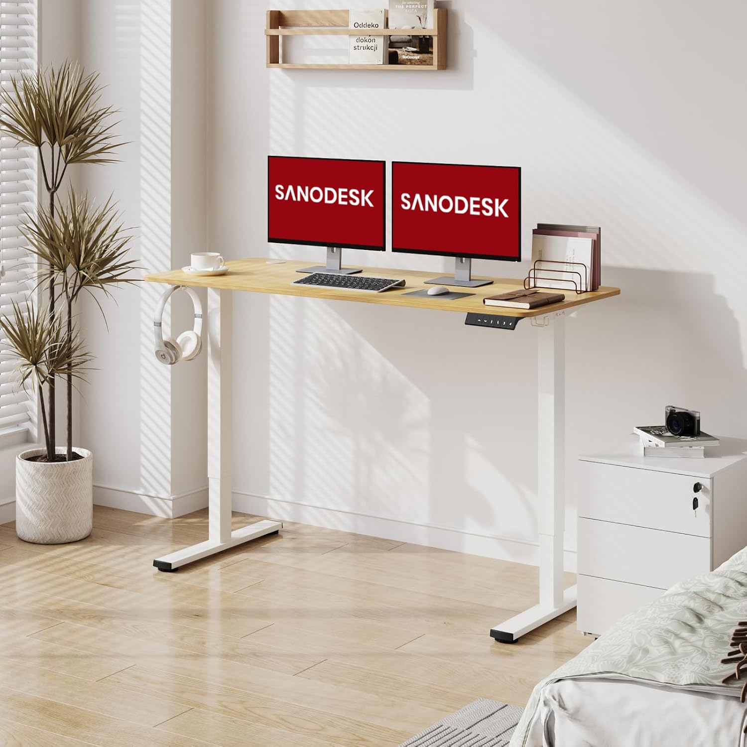 SANODESK Electric Standing Desk 55x24 Inch Height Adjustable Stand Up Desk Home Office Computer Workstation Sit Stand Home Office Desk with Splice Board (White Frame + Maple Top)