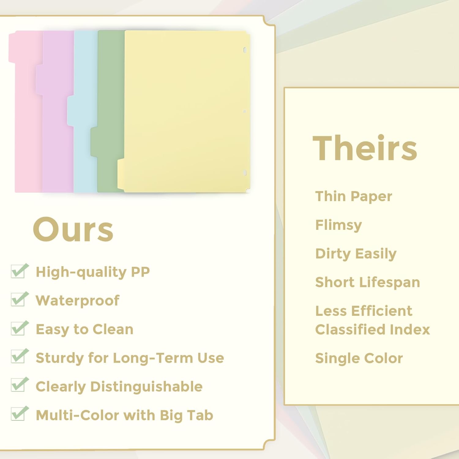 - Duarble & Quality Material: Our binder dividers are crafted from high-quality PP material, which is waterproof and stain-resistant for easy cleaning. They are soft and elastic, yet strong and resistant to tearing. These dividers are odorless and provide excellent organization for your documents, ensuring long-lasting protection.