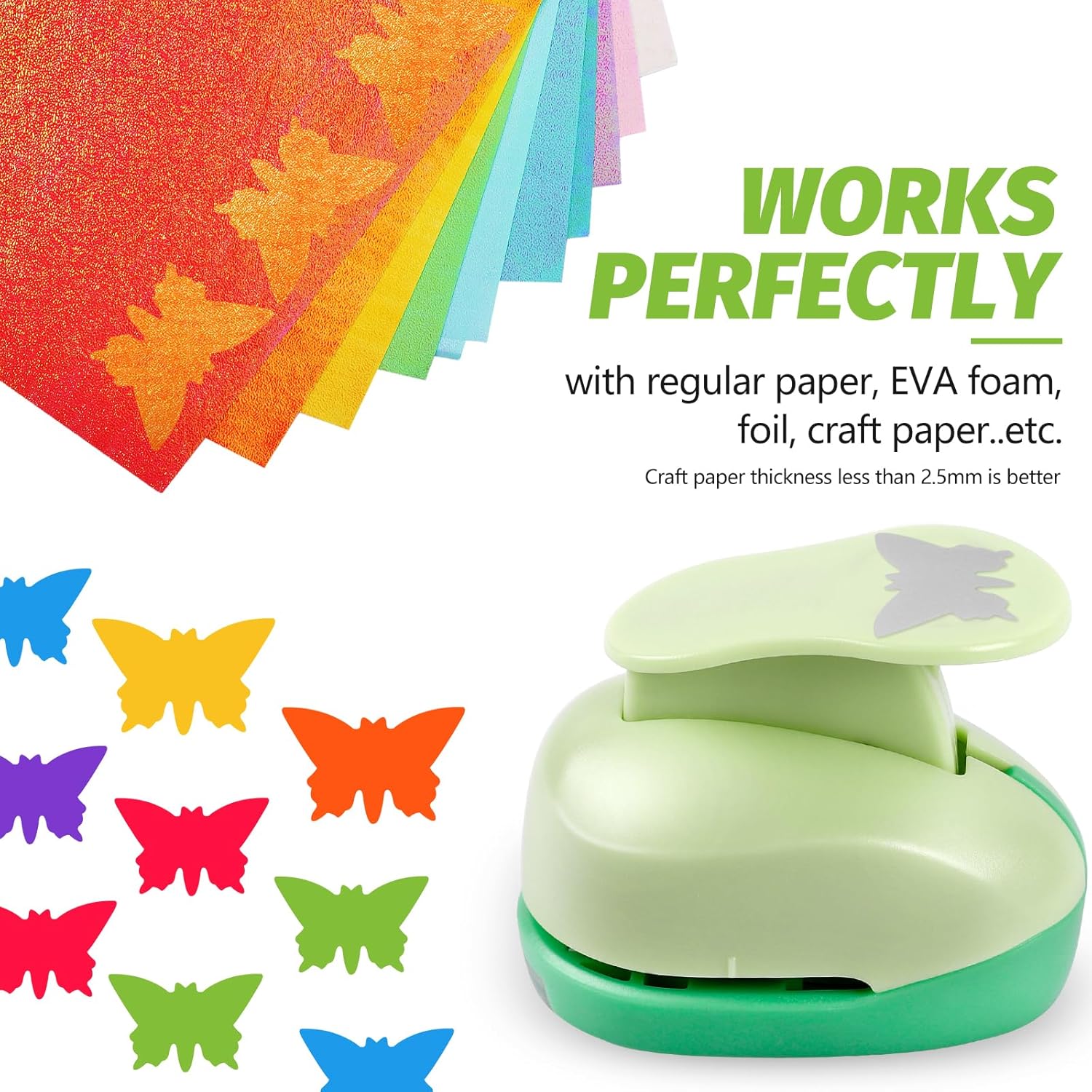 - Wide Applications : Paper hole punch is simple to use and will make perfectly butterfly shaped designs from card-stock, paper, cardboard, felt, foam, etc. If your paper is too thin, please use 2-3 layers. Cutting Sticky paper may make the paper shape punch GET STUCK