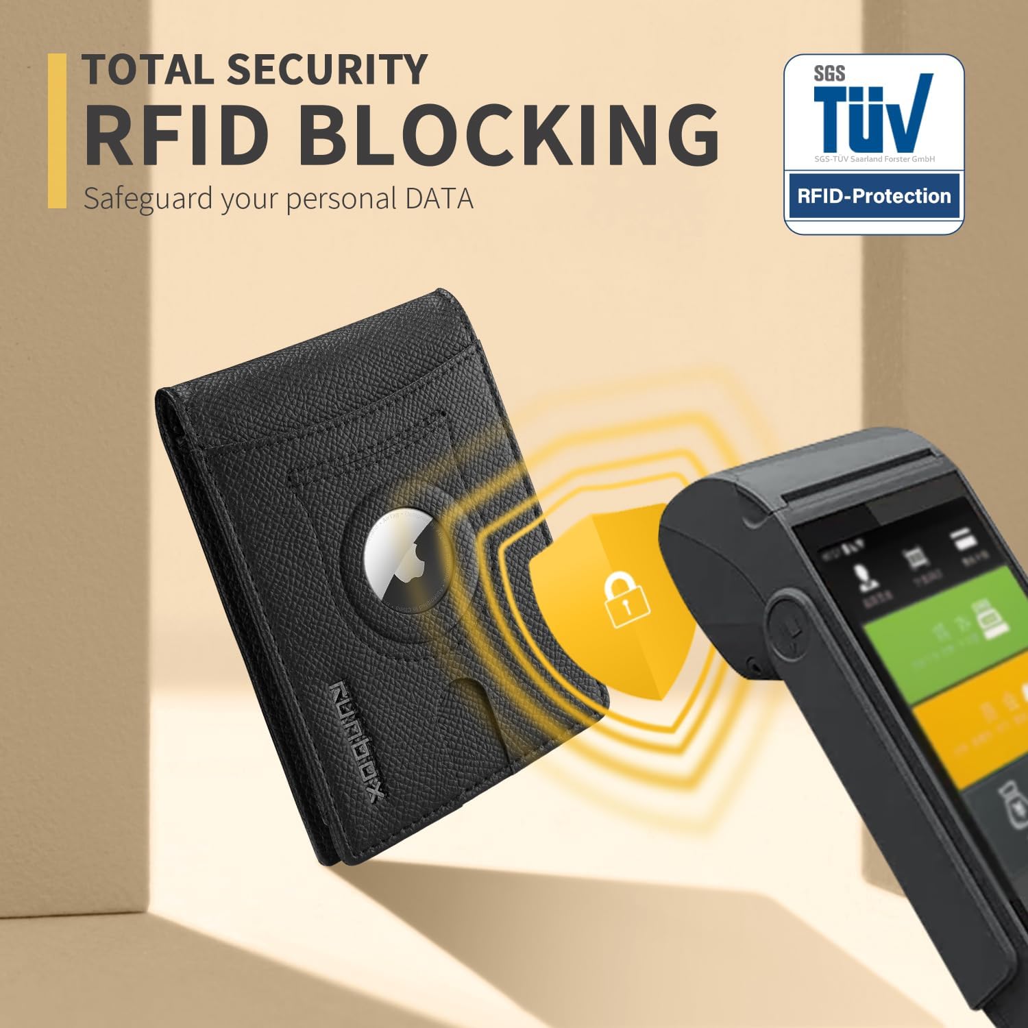 - RFID ANTI-THEFT FUNCTION - This wallet for AirTag boasts RFID blocking shield technology, safeguarding your personal and financial data against unauthorized scanning and identity theft. Enjoy peace of mind knowing that your information is safe and secure