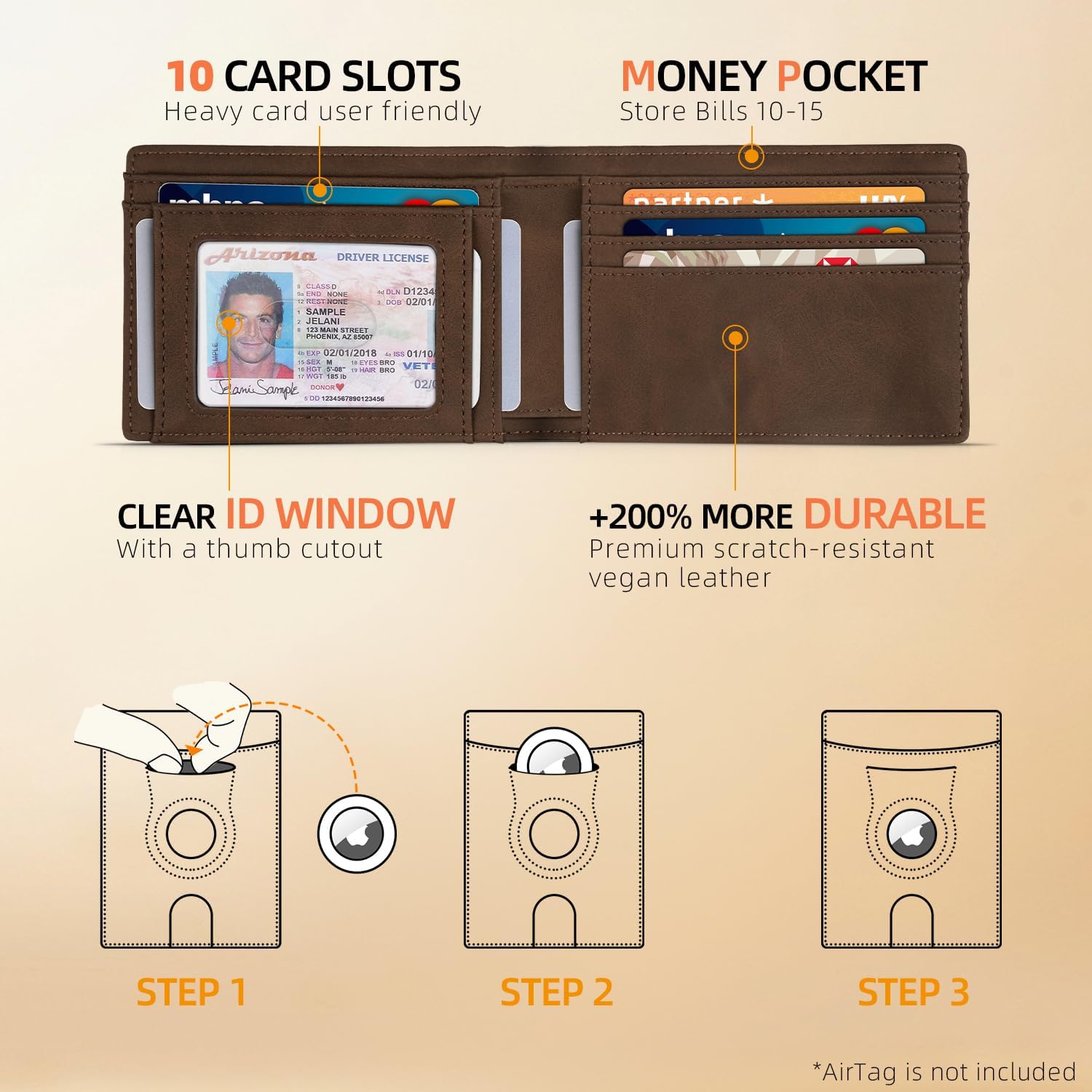 - NO MONEY CLIP DESIGN - Measuring 4" x 3.5", this slim men's wallet boasts a bill compartment that occupies less space than a metal money clip, effectively reducing bulk. It includes 11 card slots, featuring a quick-access slot on the front, 10 slots on the wallet sleeves, and 1 integrated AirTag pocket. (AirTag is not included)