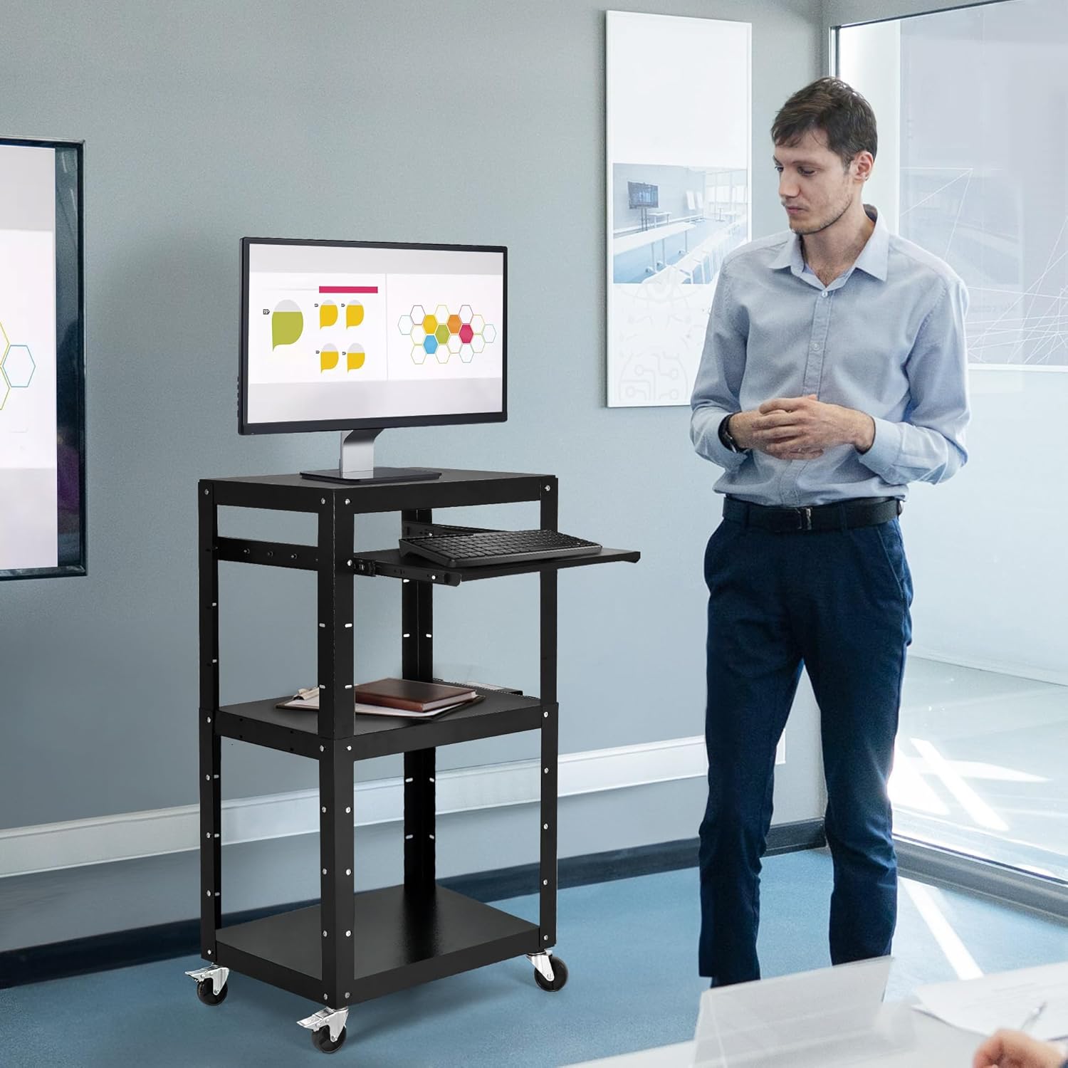 DWVO AV Cart with Wheels and Power 16.4ft Extra-Long Cord, Metal Presentation Cart with Keyboard Tray, Rolling Large Media Carts with 2 Locking Brakes, Easy to Assemble, Black