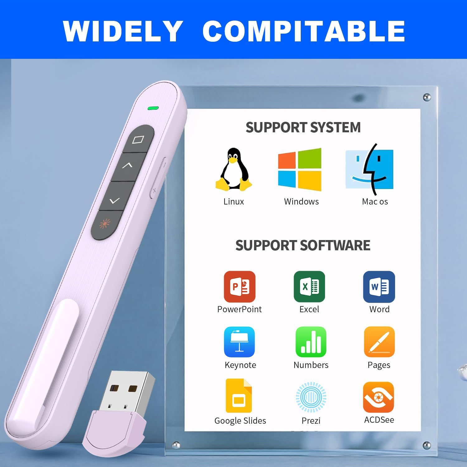- Compatible Devices : Presenter remote for MS Word, Excel, PowerPoint, ACD See, iWork (Keynote & Numbers & Pages) Google Slide, Presentation clicker for Mac, Windows Linux, Android, Presentation remote for laptops, presentation electronic whiteboards, projectors Presenter remote for MS Word, Excel, PowerPoint, ACD See, iWork (Keynote & Numbers & Pages) Google Slide, Presentation clicker for Mac, Windows Linux, Android, Presentation remote for laptops, presentation electronic w… See more