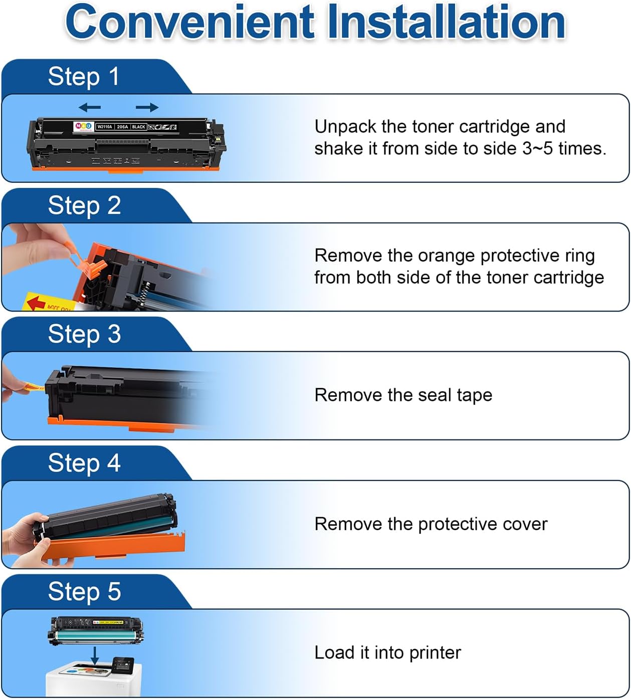 - Latest Chip: the 4 pack 206A toner cartridges adopt latest upgraded chip which is built inside which can insure instant recognition by printers and perfect compatibility