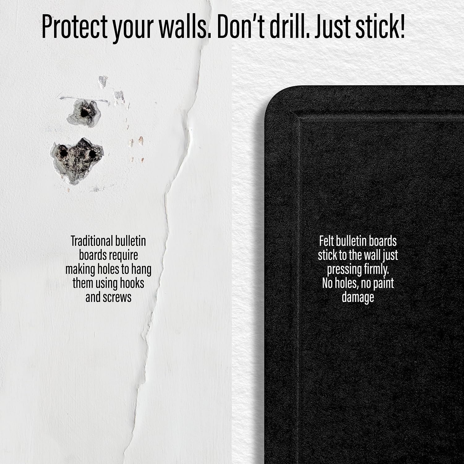 - EASY TO INSTALL, SAFE FOR WALLS – This bulletin board uses a hook and loop system to attach securely to the felt board, paired with a strong adhesive backing that sticks to your wall. Setup is quick, clean, and damage-free—no tools, glue, or nails required. Safe for homes, classrooms, and offices, this black cork board makes mounting effortless.