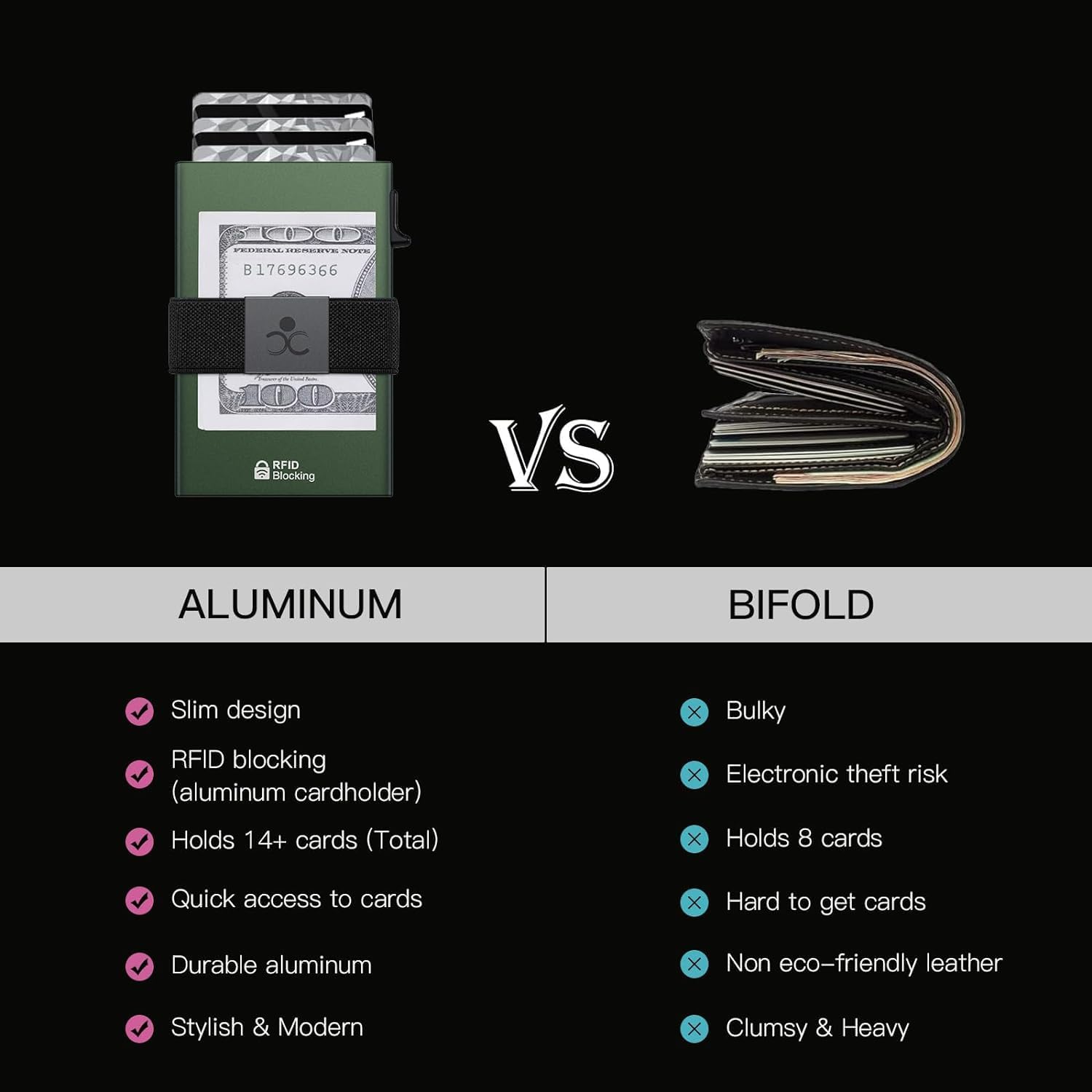 - π³ ULTRA THIN PROFILE: The Minimalist tactical wallet is very thin and can be carried comfortably in a front pocket. The aluminum cardholder size is 3.9*2.5*0.5in,weight only 2.6oz . And expandable backplate designed for additional storage. Ditch the bulk, less is more.